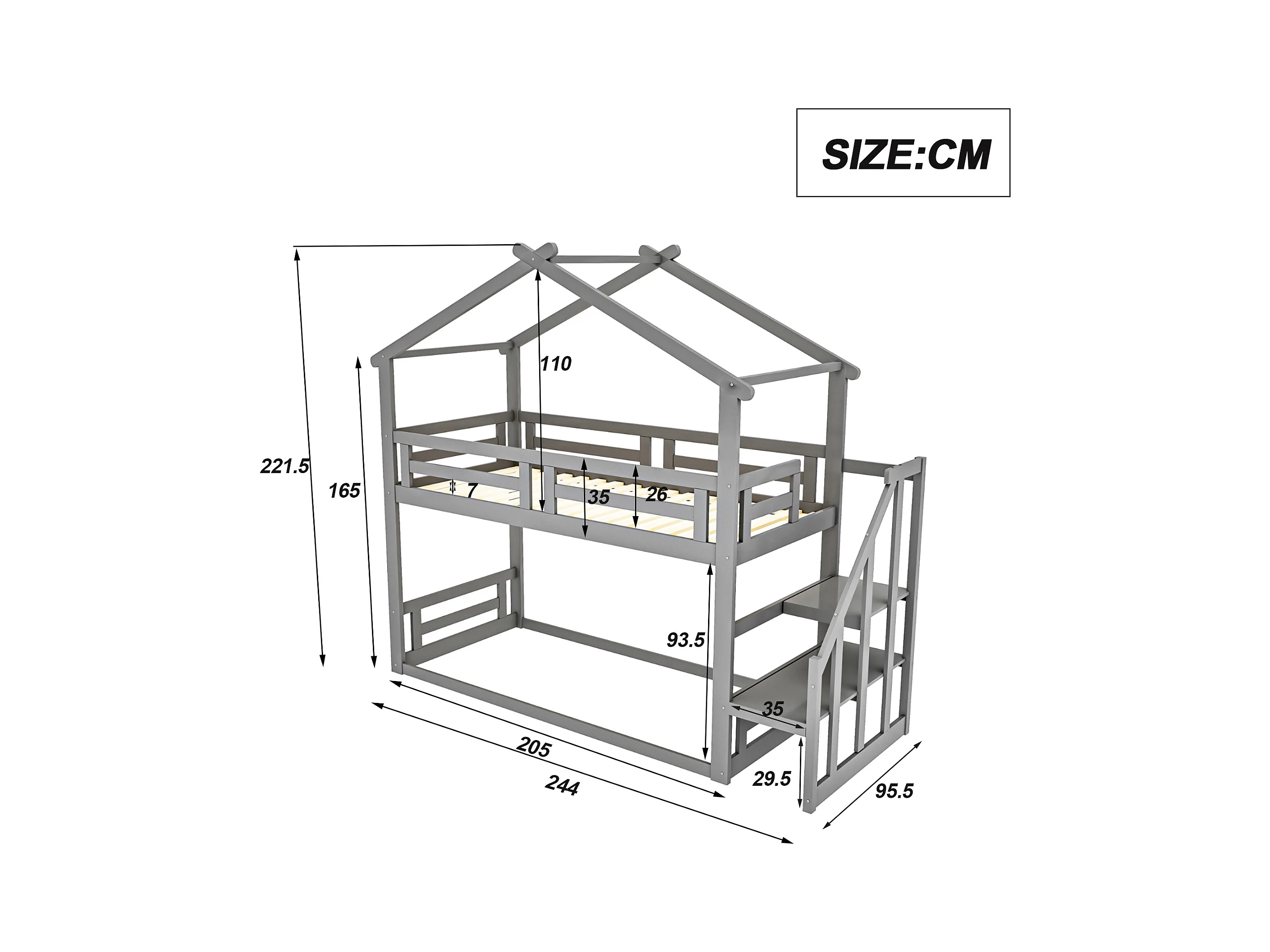 Stapelbed 90x200cm, huisbed met ladder, lades en kledingkast, grenen, grijs (244x95x160 cm)