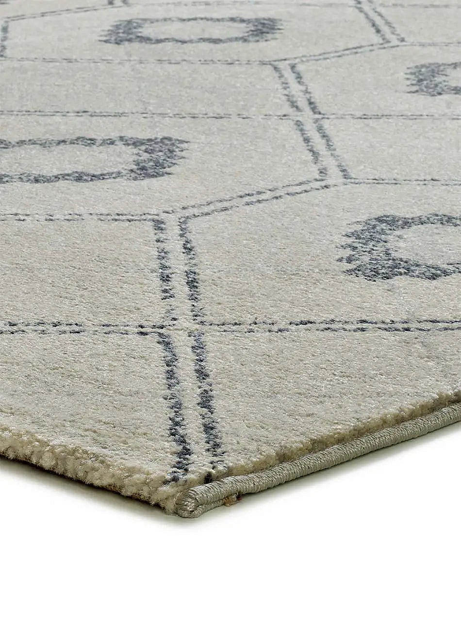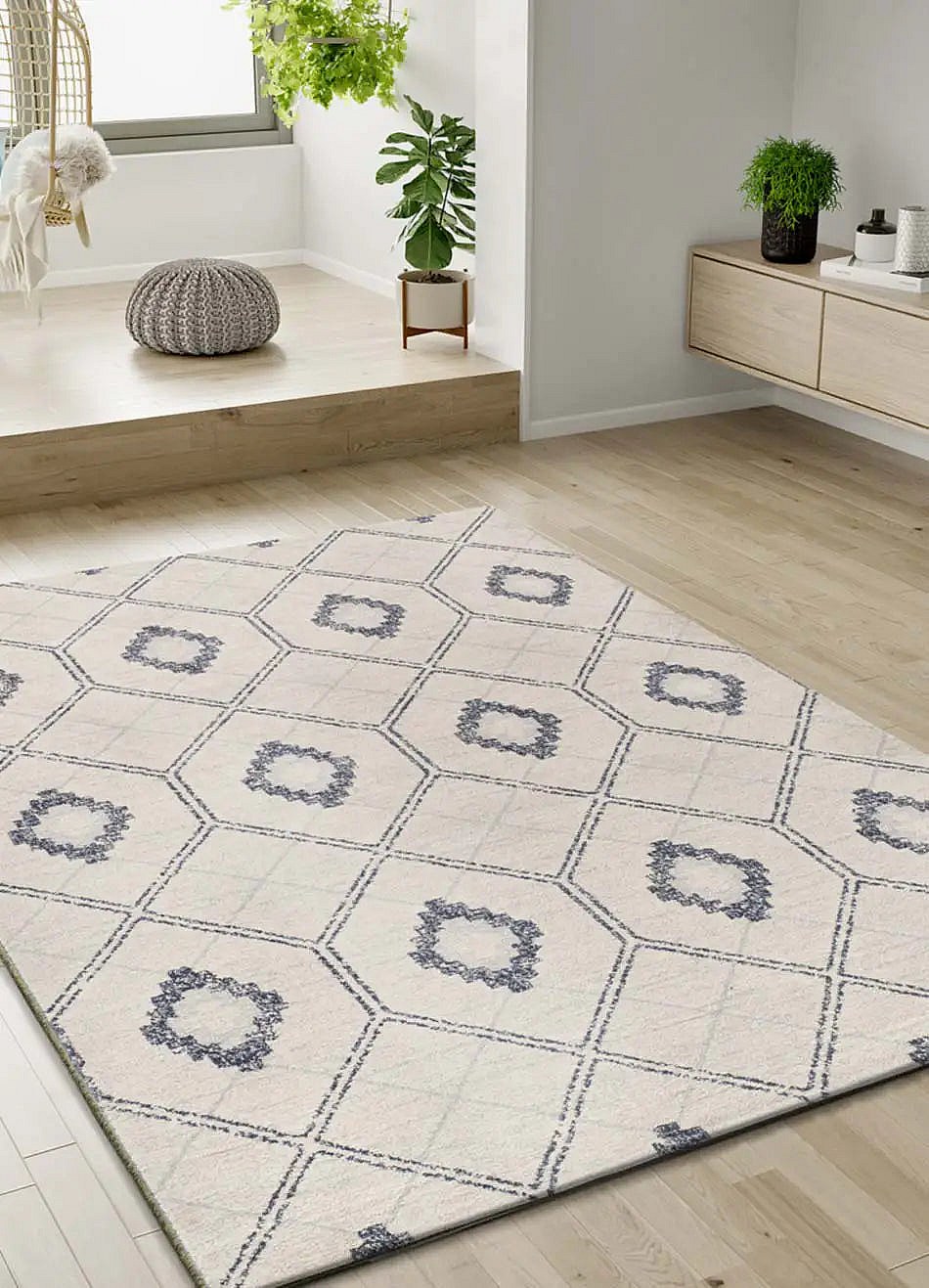 Het geometrische Siroco-vloerkleed combineert vierkanten en ruiten in blauwachtige tinten, geïnspireerd op ornamentale decoratie. Dit vloerkleed voor de woonkamer of slaapkamer past perfect bij elk interieur.