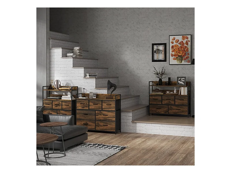 Ladekast, kledingkast, opbergmeubel, 5 stoffen lades met handgrepen, metalen frame, bruin