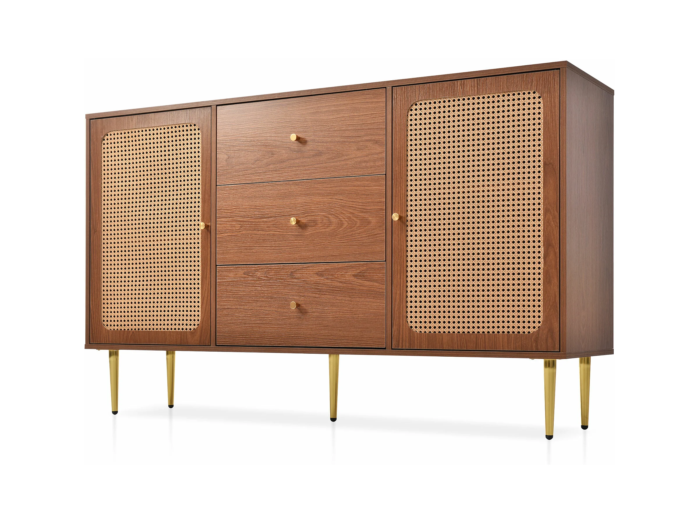 Ladekast met 2 deuren en 3 laden, rotanpatroon, MDF + spaanplaat + metaal, walnootkleur - H90/L150/D40 cm