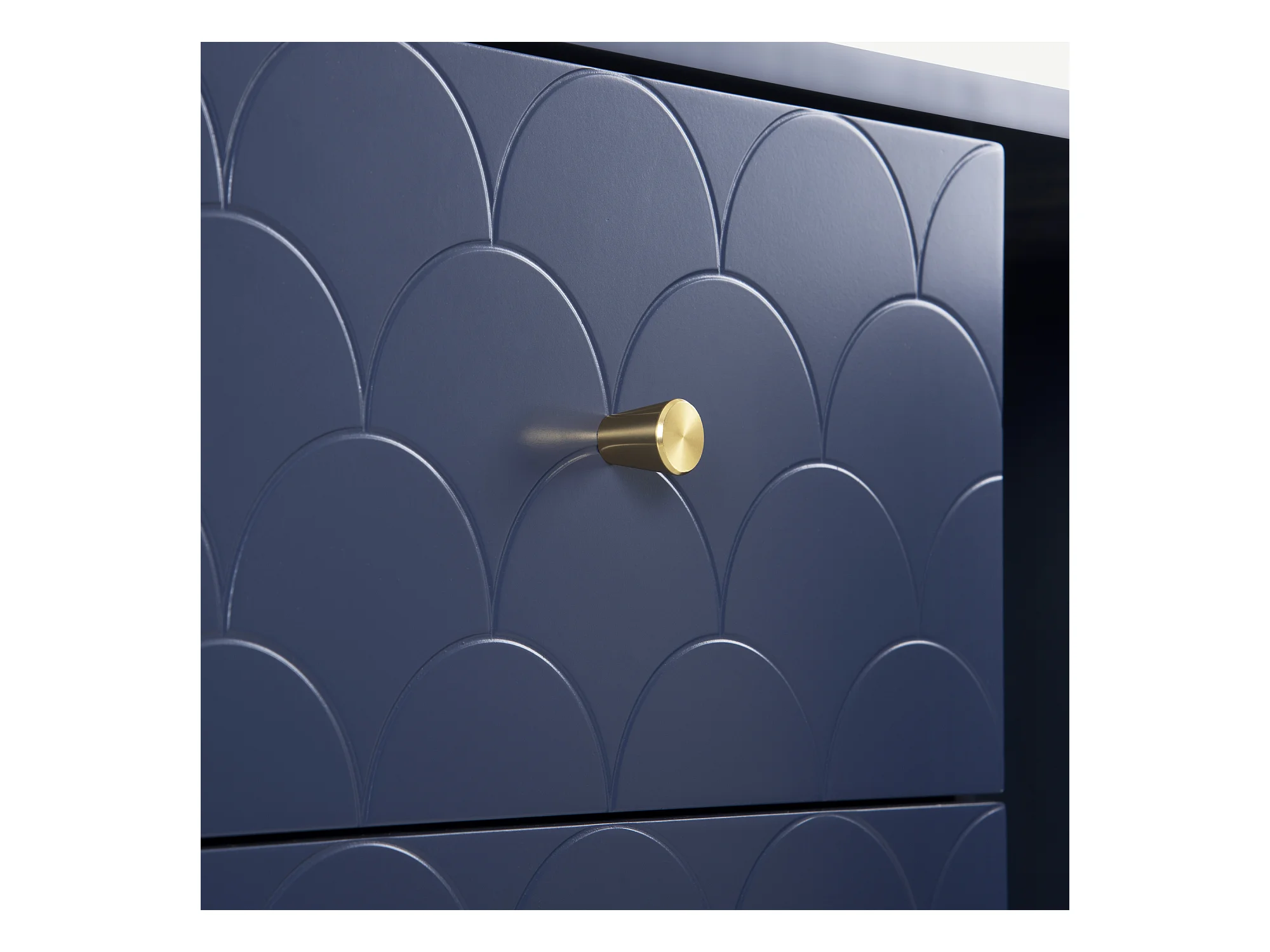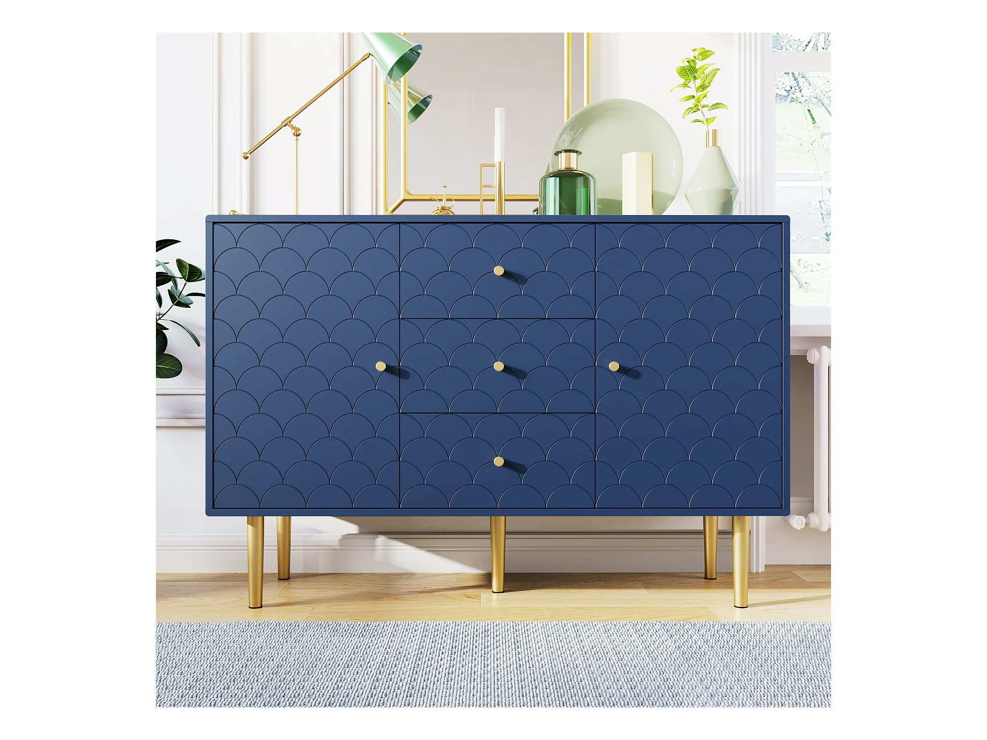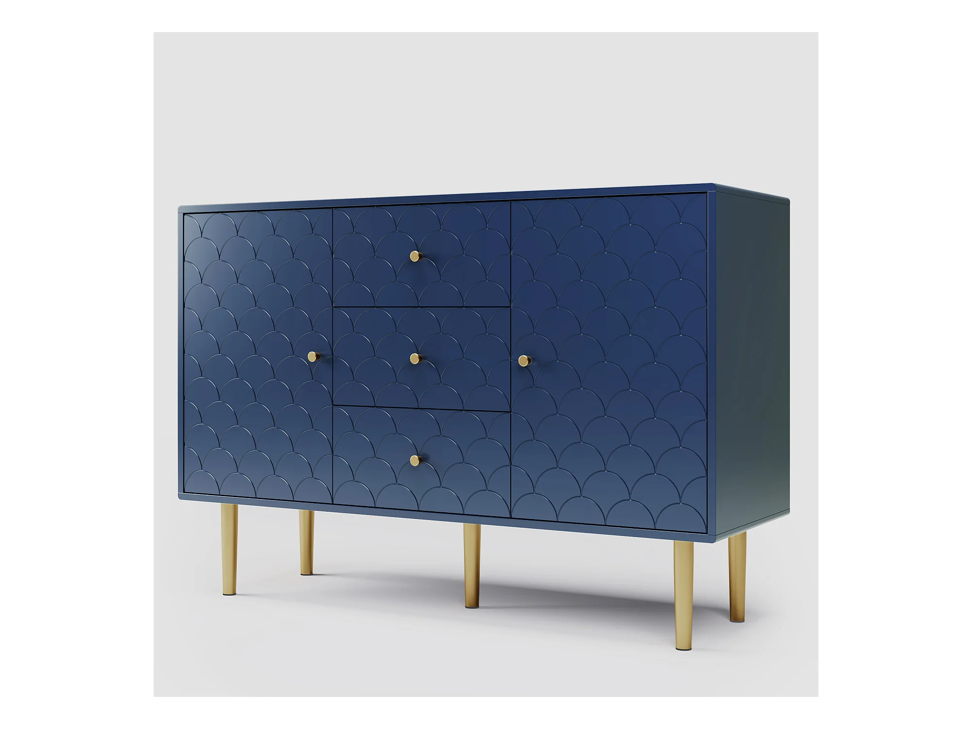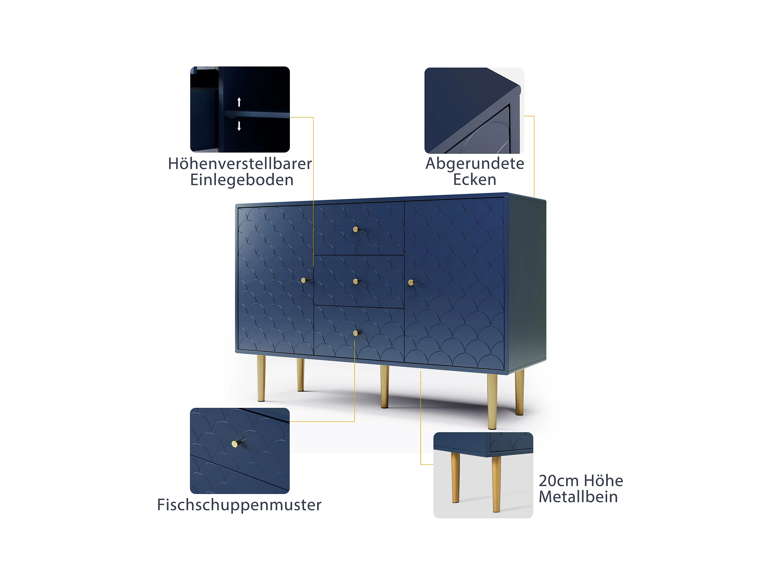 Ladekast met 2 deuren en 3 laden, Verstelbare plank, Massief hout + spaanplaat, Marineblauw - H82/L120/D40 cm