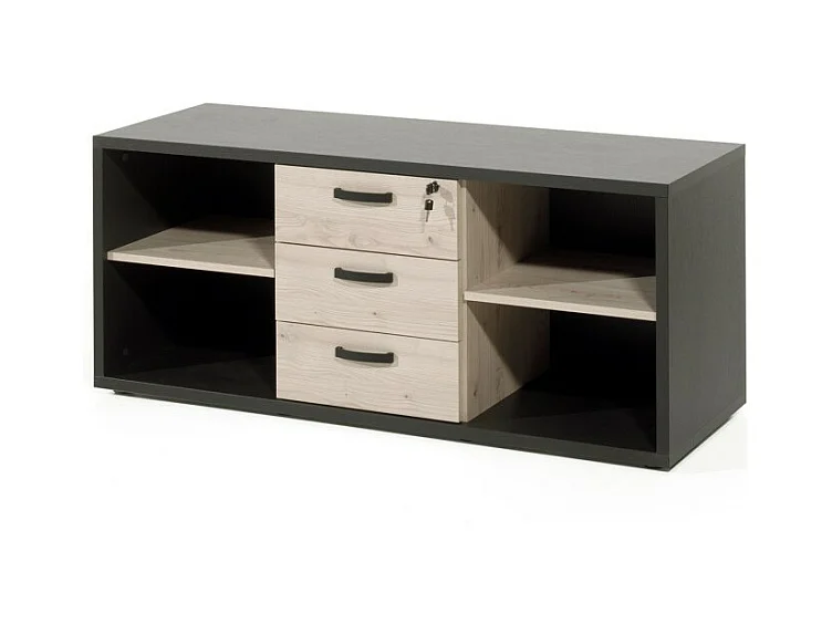 Lage buffetkast voor kantoor met 4 vakken en 3 lades, in lichte eiken- en zwarte kleur