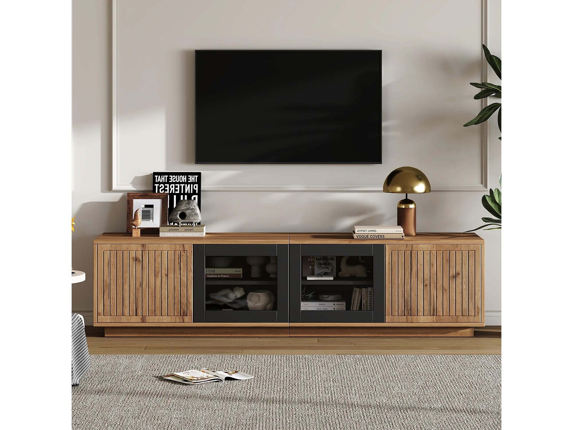 Lage tv-kast 180×40×45 cm, kleur hout/naturel en zwart, ledverlichting, 2 glazen deuren, voor tv's tot 75"