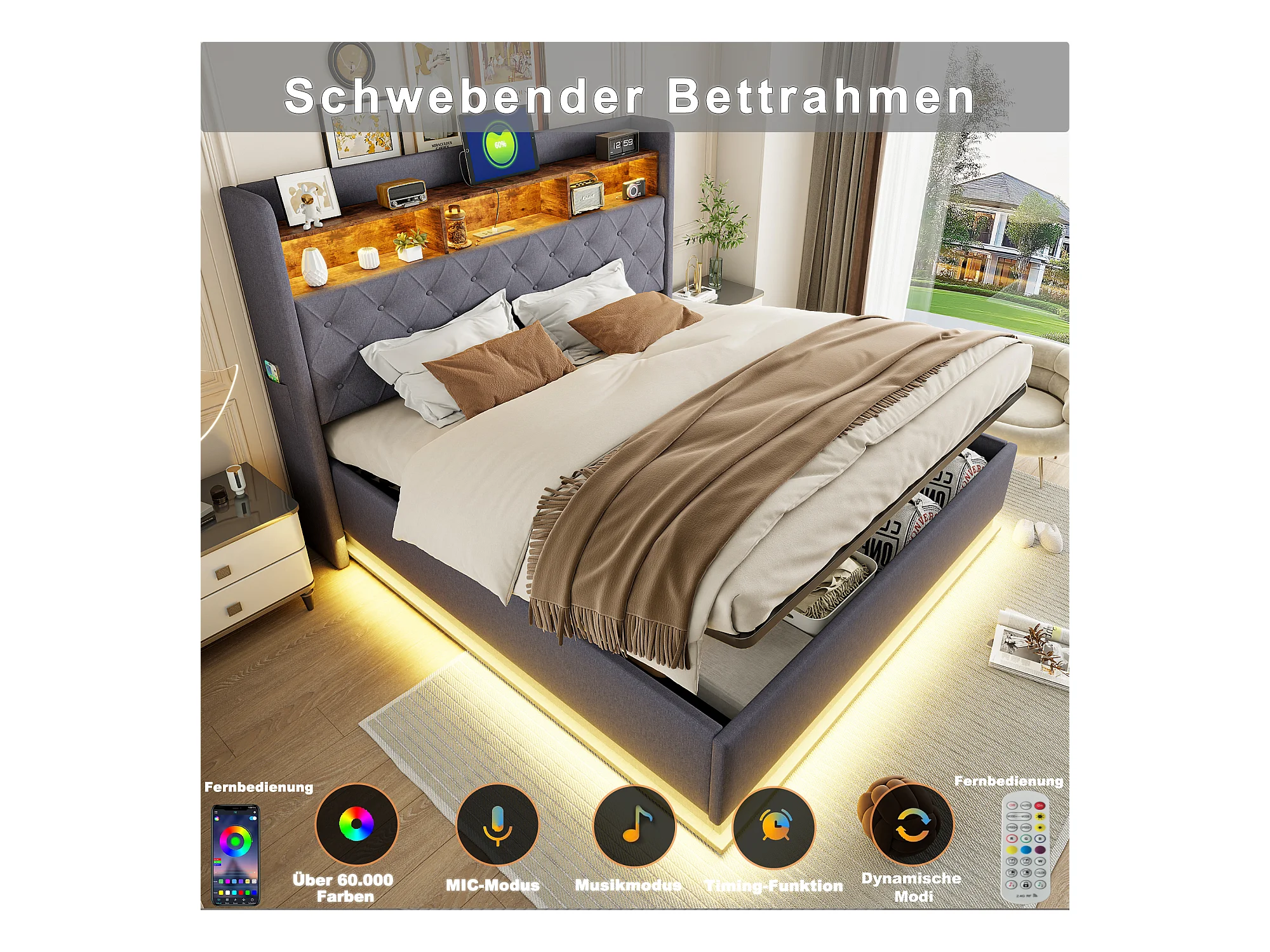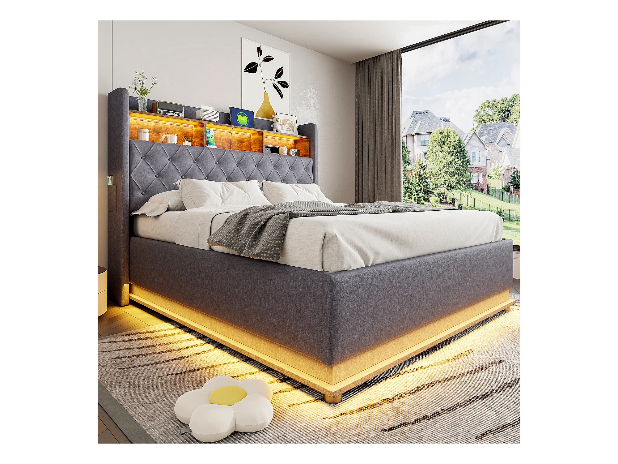 Tweepersoonsbed 160x200 cm met LED-hoofdbord, opbergruimte en 2 nachtkastjes, in grijs fluweel (213x247x105 cm)
