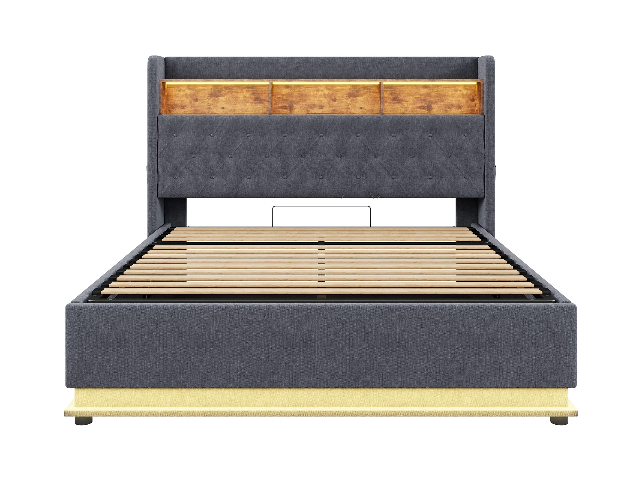 LED-bed 160 x 200 cm, met hydraulische opbergruimte, USB- en Tape-C-aansluiting, linnen stof, grijs (214x166x113 cm)
