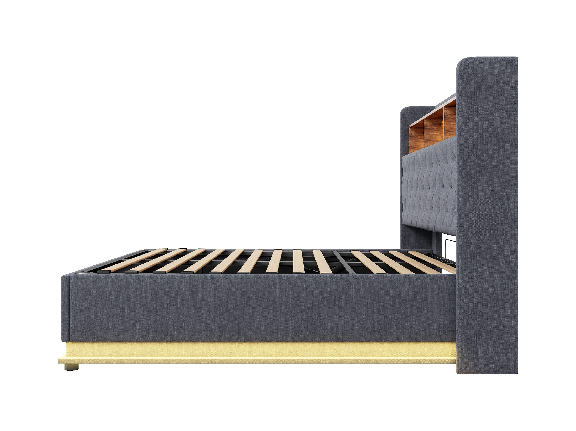 Gestoffeerd bed, tweepersoonsbed 160×200 cm, opbergbed, bedframe met USB-C en volvlaks lattenbodem, zonder hoofdeinde, katoen, grijs, zonder matras