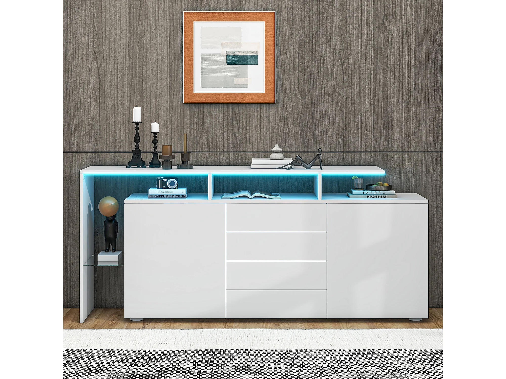 LED eetkamer dressoir met 2 deuren en 4 laden - open opbergruimte en glazen planken - hout - wit (160x35x72 cm)