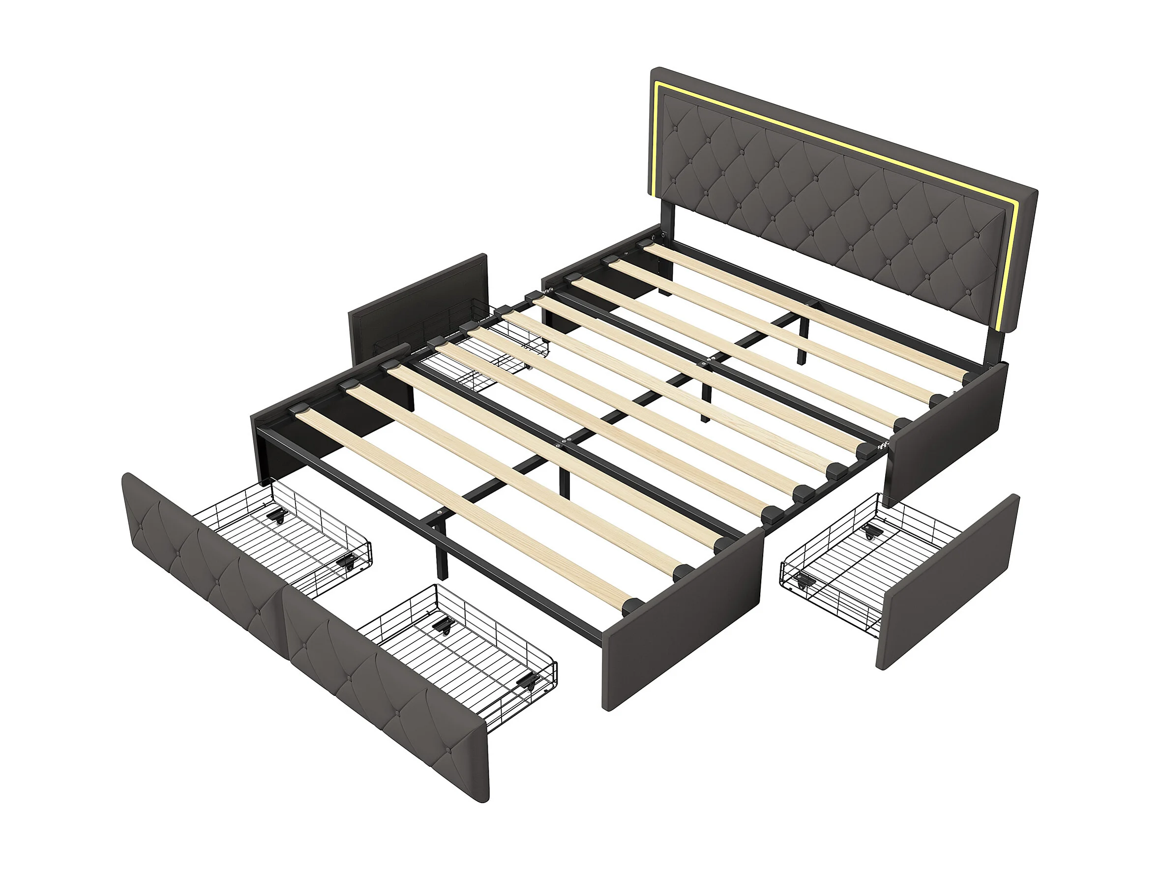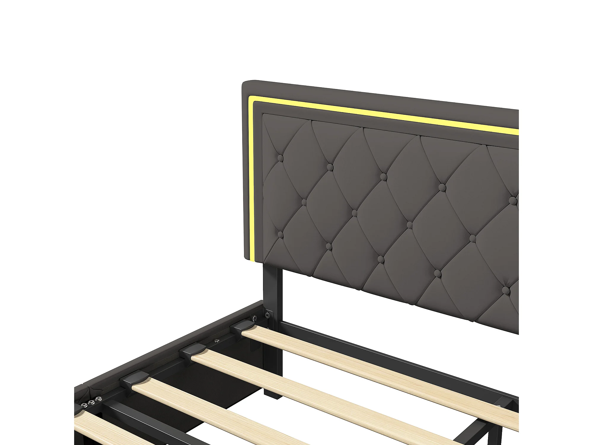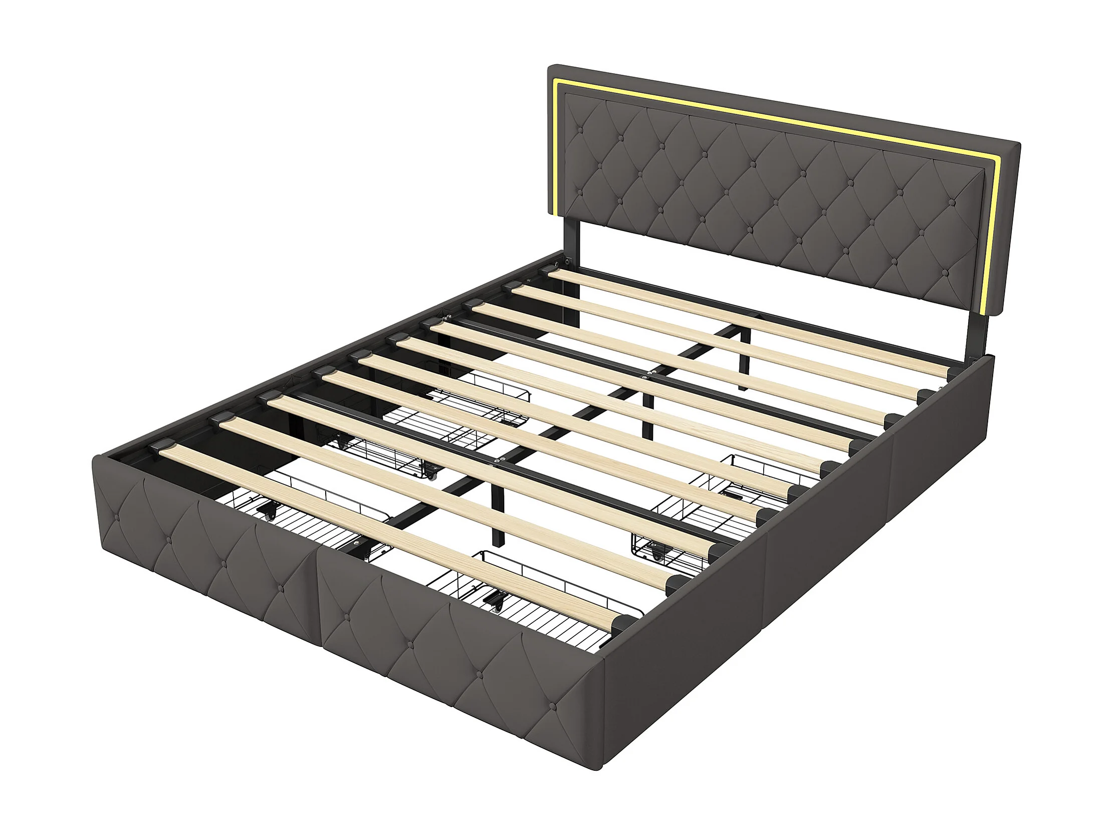 LED gestoffeerd bed 140 x 200 cm, met 2 lades en lattenbodem, verstelbaar hoofdeinde, PU, Grijs
