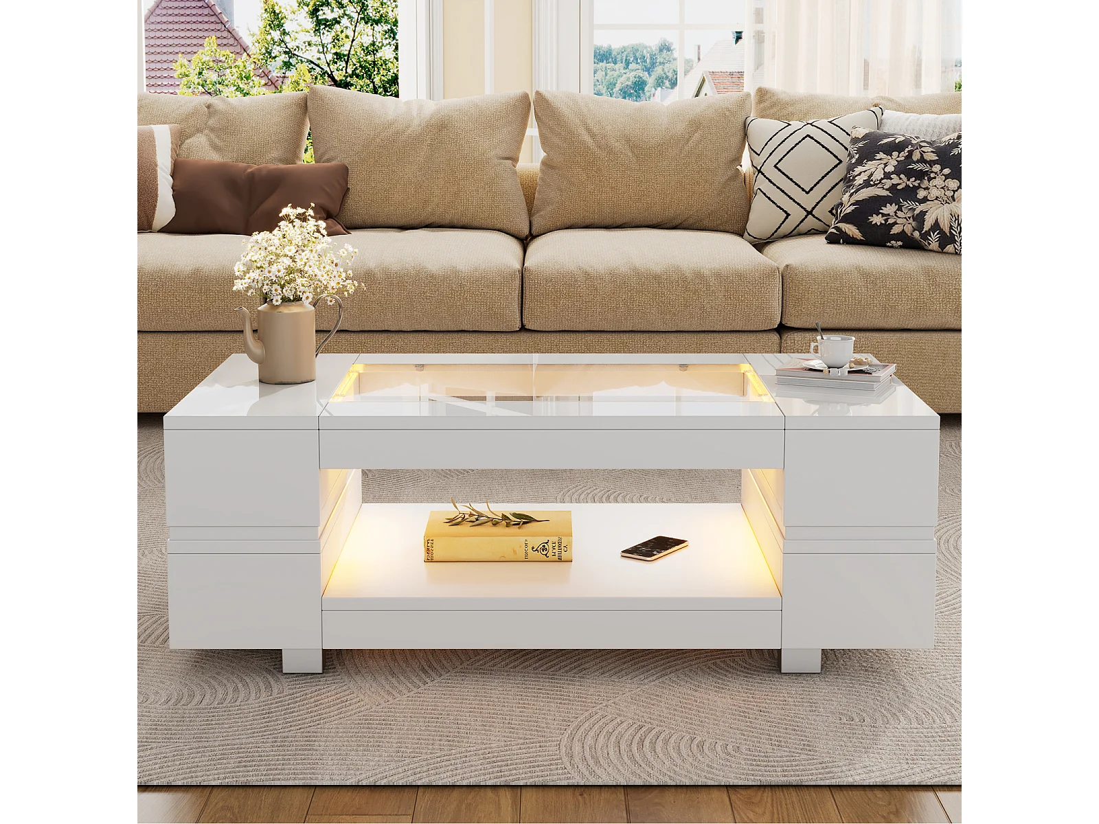 LED salontafel voor in de woonkamer, witte salontafel met open opbergruimte, glazen blad, 100 x 50 x 35 cm
