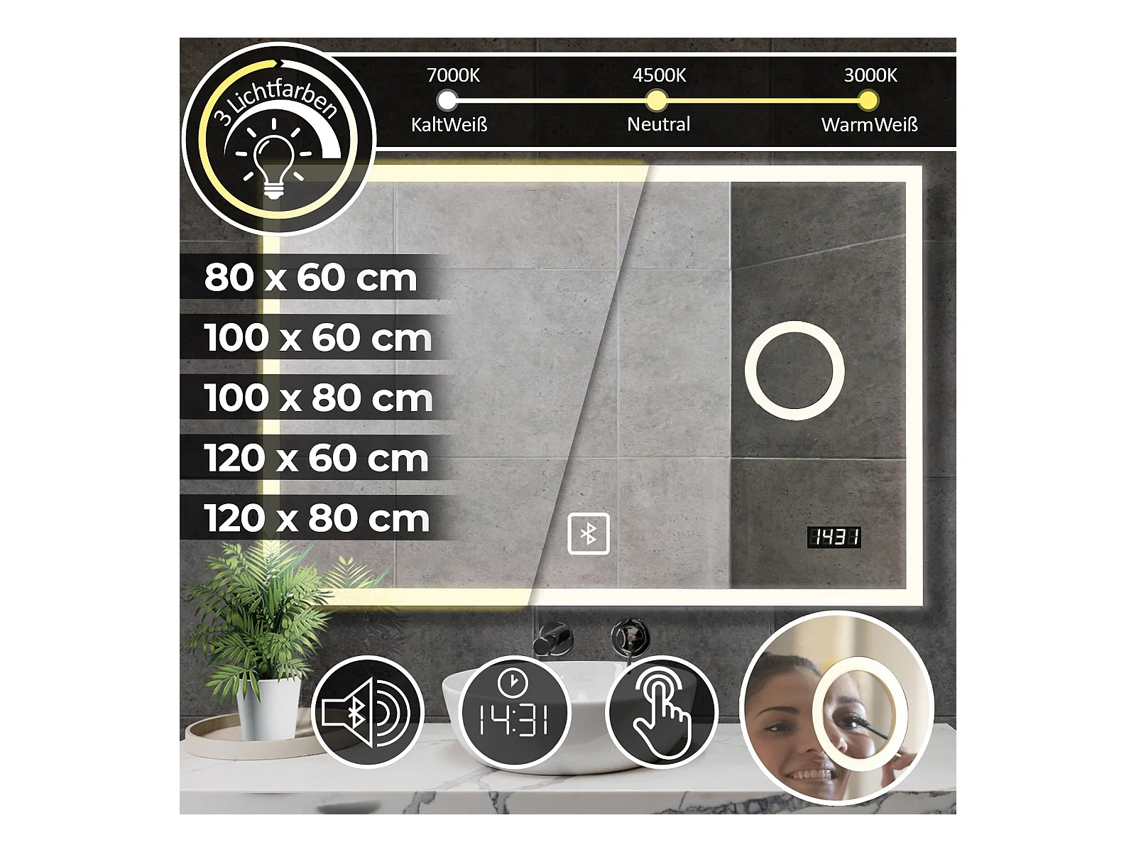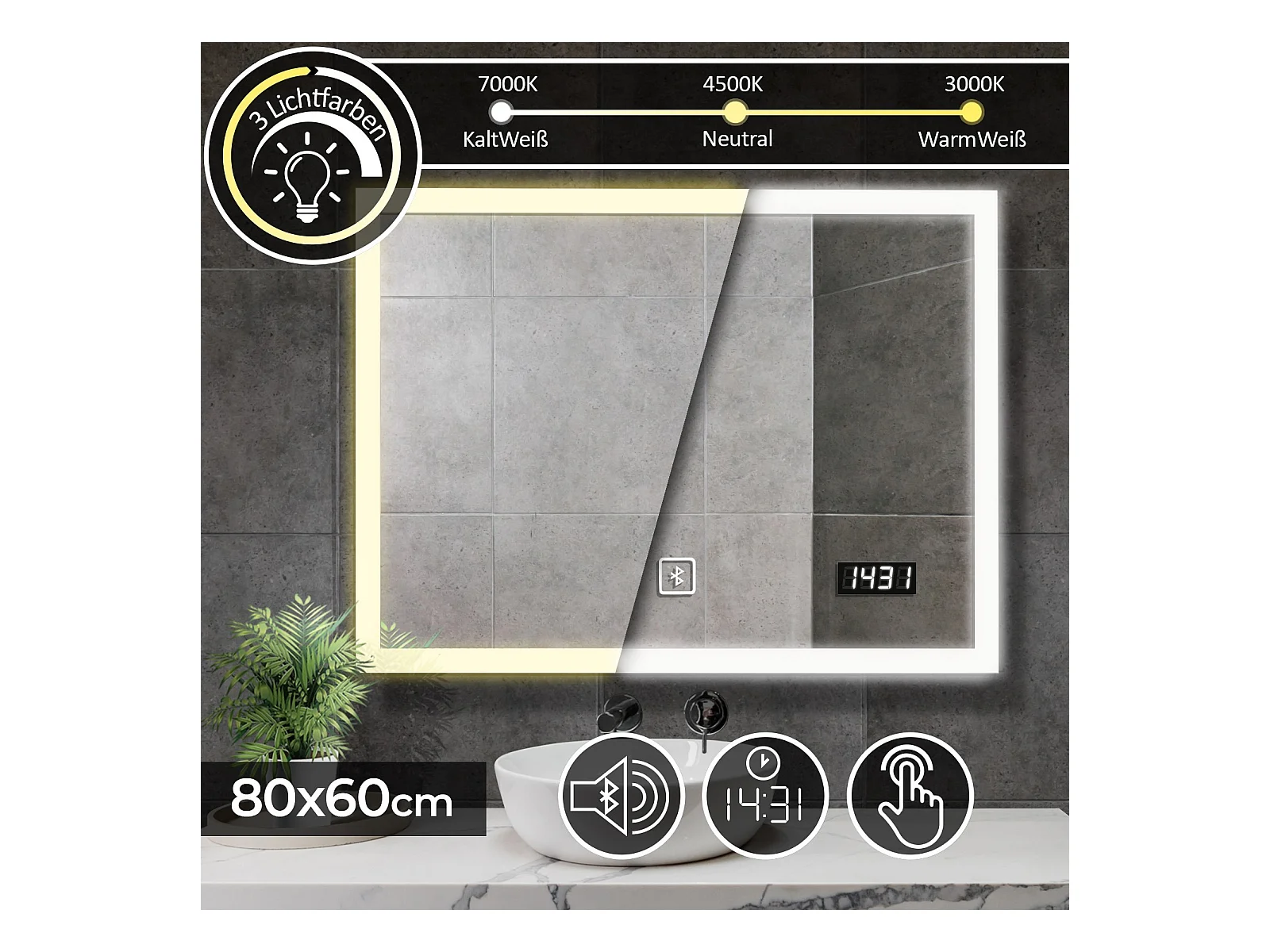 Led spiegel - 80x60 cm - met bluetooth speaker + digitale klok