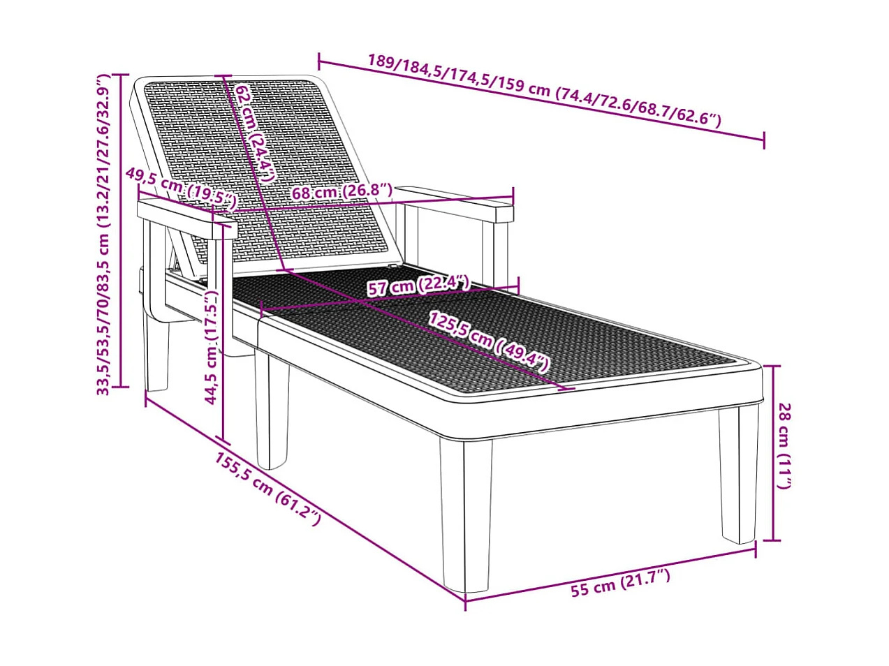 Ligbed in 4 standen verstelbaar 155,5x57x28 cm polypropeen
