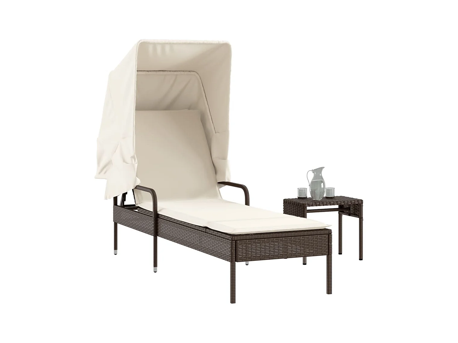 Ligstoel met zonnescherm en tafel in bruin gevlochten hars