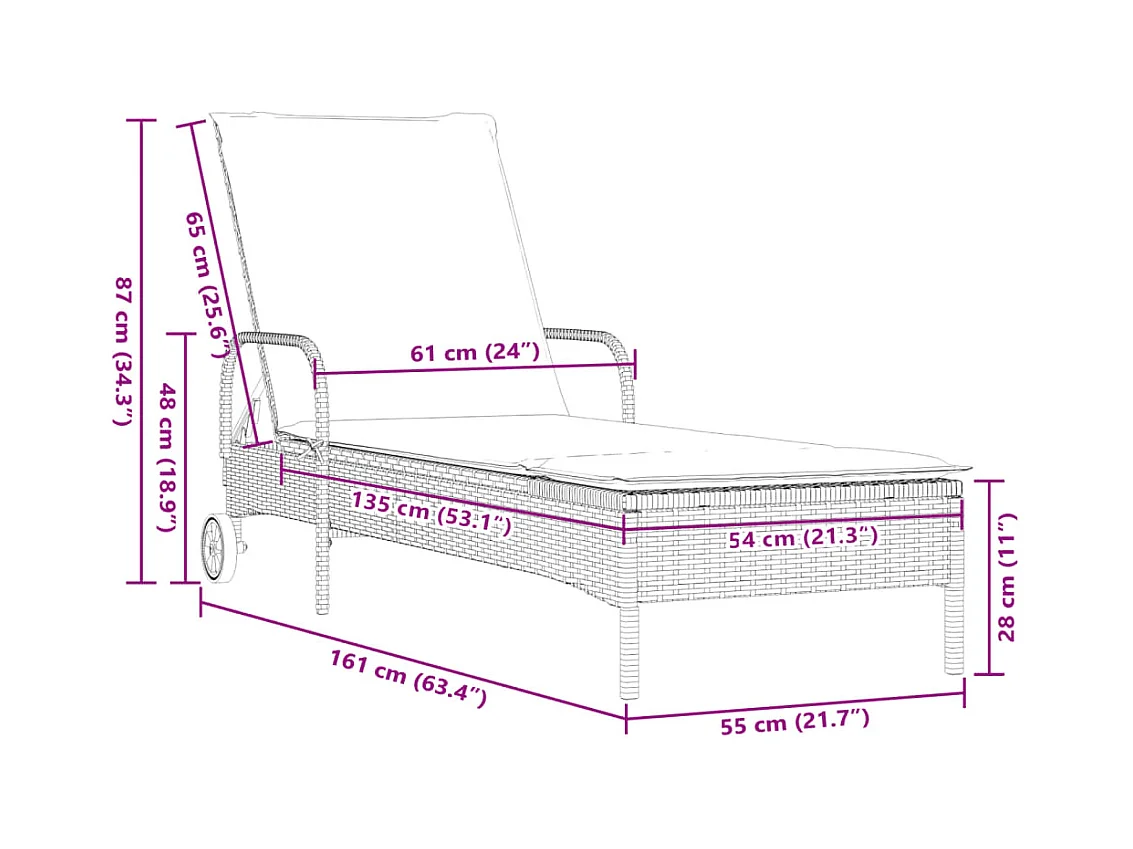 Ligbed met wielen en kussens poly rattan lichtgrijs