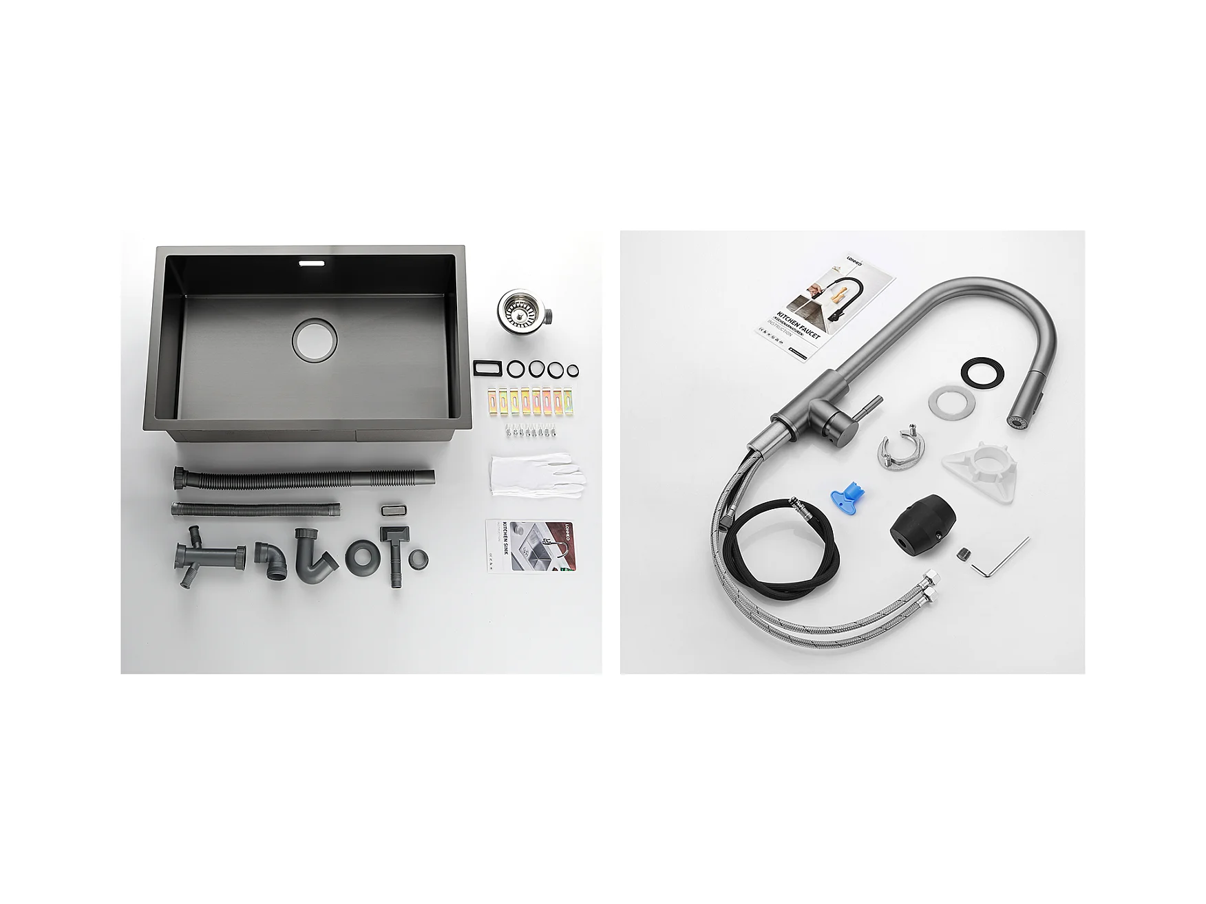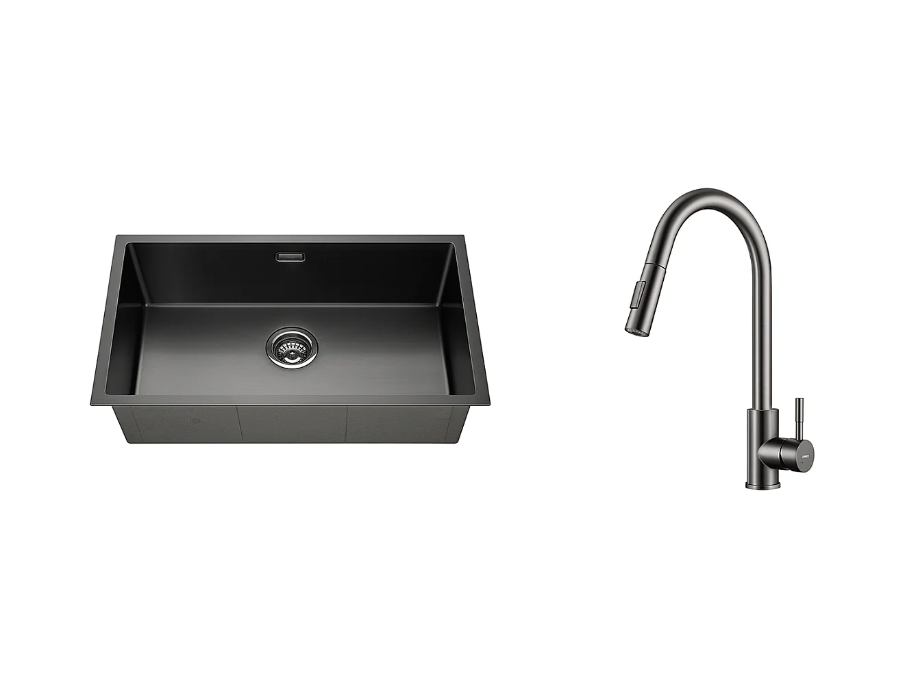 Lonheo Max Aanrecht 1 Bak 74*44*20CM, in geborsteld roestvrij staal met sifon en overloop + keukenkraan Uittrekbare douchekop Donkergrijs 360 ° roterend