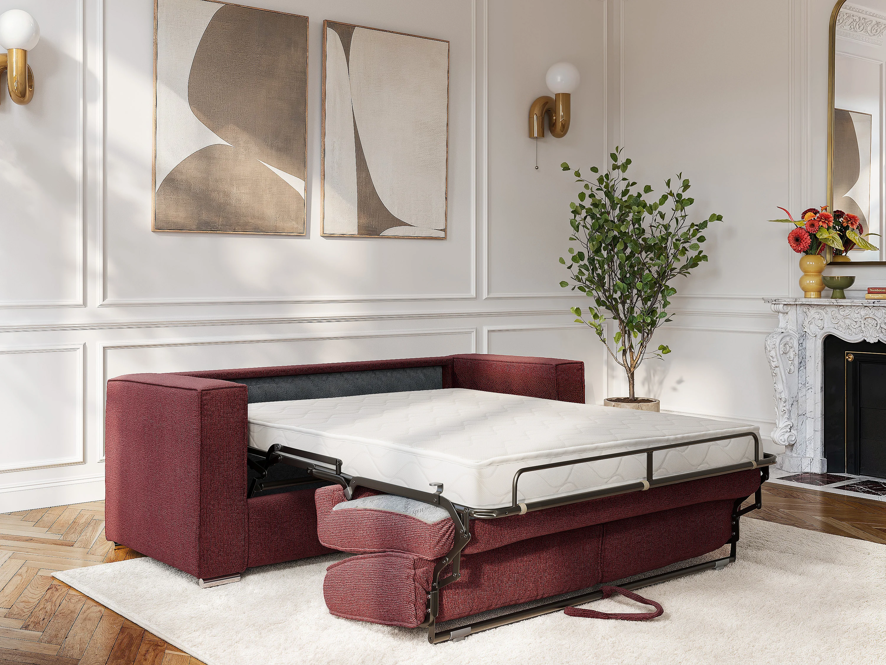 Express-driezitsslaapbank in bordeauxrode chenille stof - Slaapoppervlak met brede latten 140 cm - Matras 14 cm LORETO