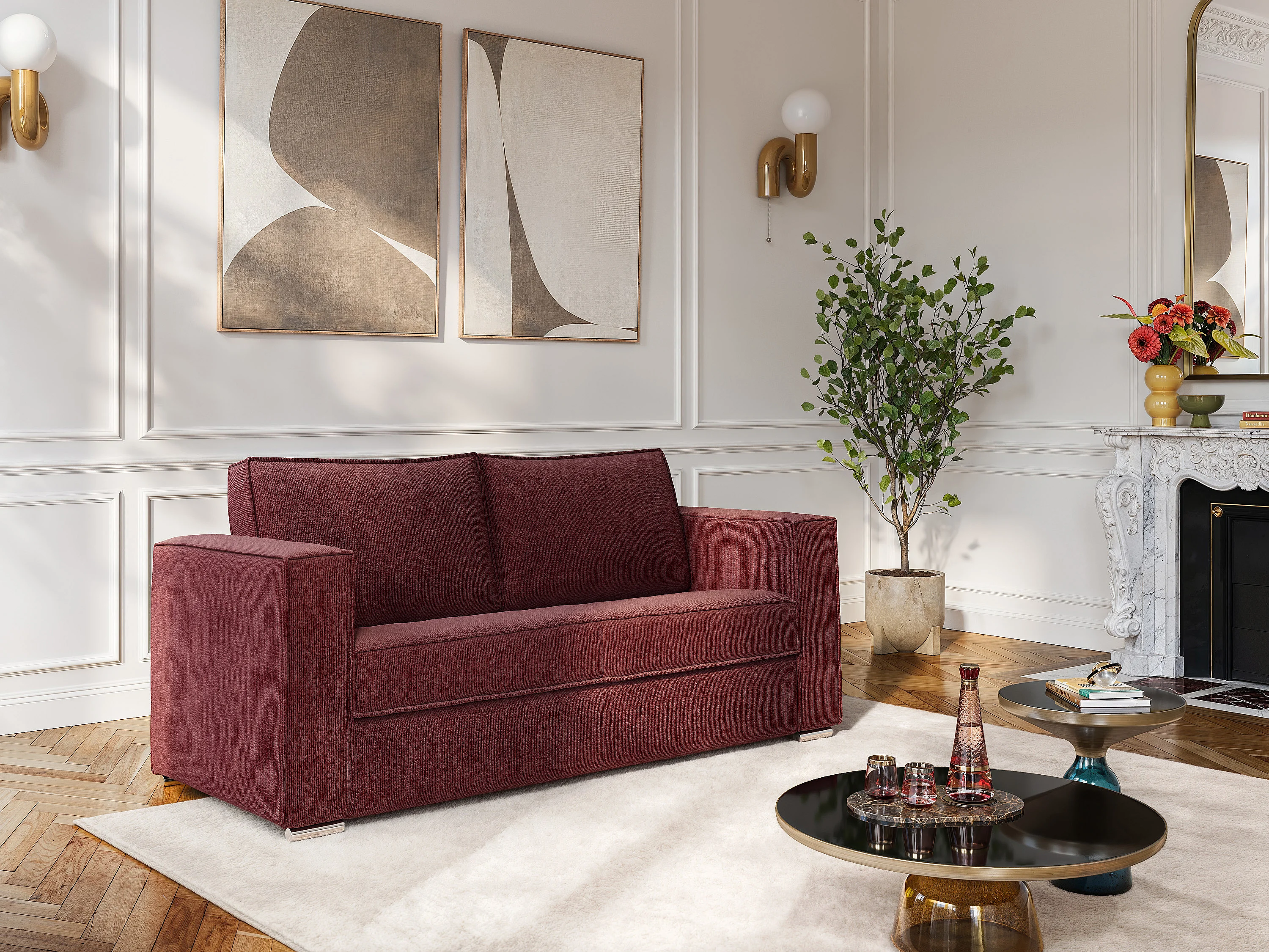 Express-driezitsslaapbank in bordeauxrode chenillestof - Slaapoppervlak met brede latten 140 cm - Matras 18 cm LORETO