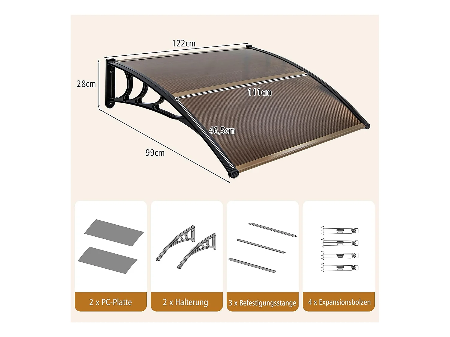 Voordeurluifel SucceBuy, 112,5x61 cm, Metalen Buitendeurluifel, Stalen Frame, Regen Overkapping, voor Voordeuren, Balkons