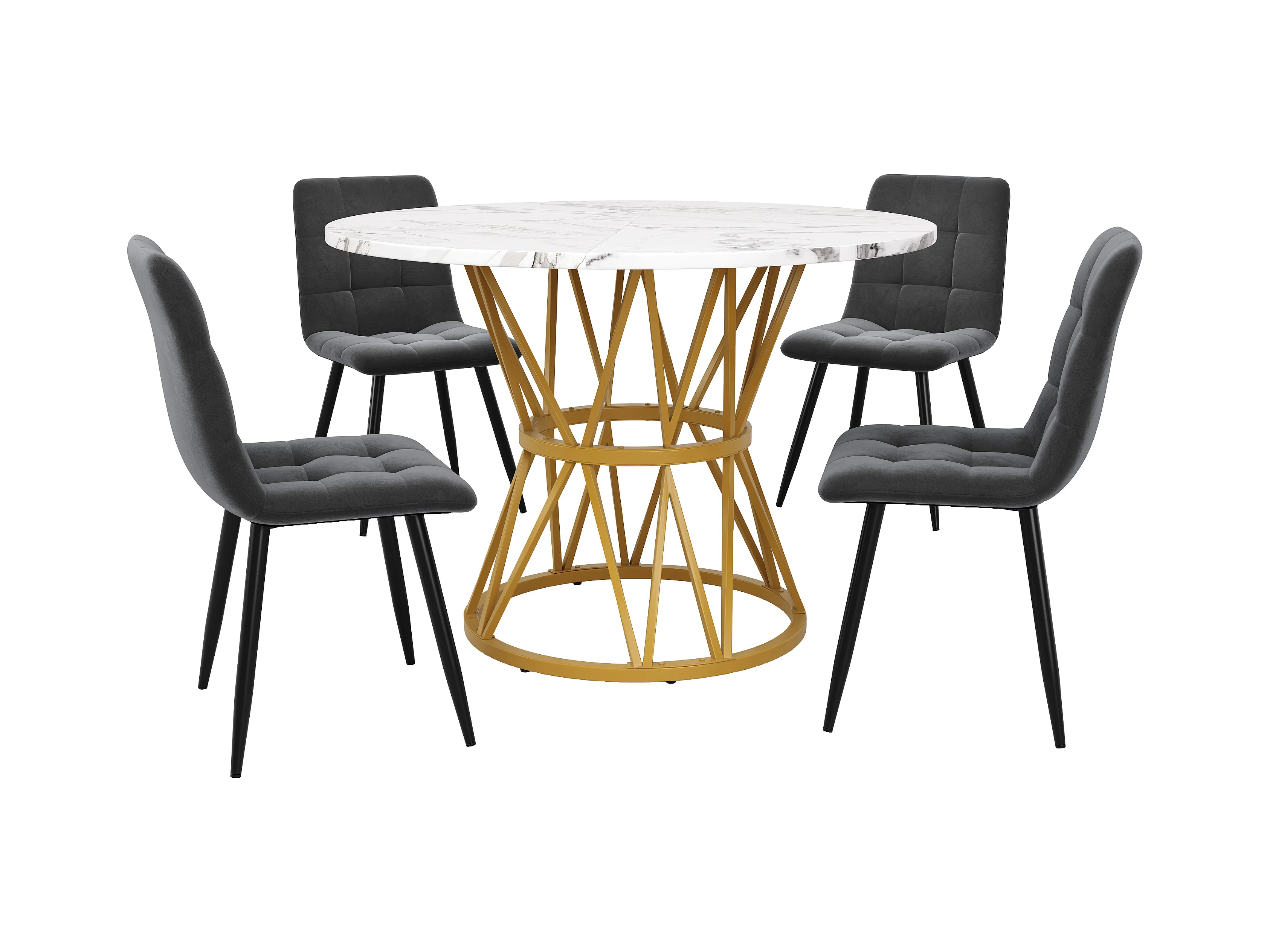 Luxe ronde eetkamerset, 4 grijze fluwelen stoelen, gemarmerd MDF-blad, gouden metalen poten (100x100x76cm)