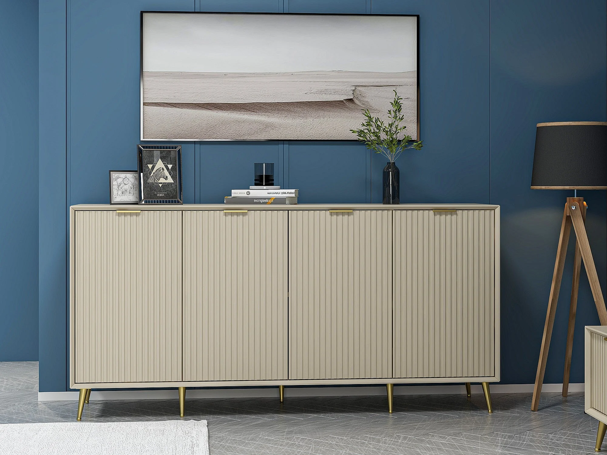 Dressoir – 180 cm x 75,5 cm x 46,6 cm – Kleur travertijn en zandsteen – Materiaal: melamine gecoate spaanplaat