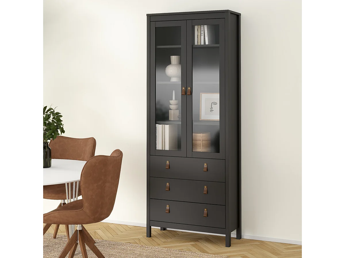 Madrid vitrinekast 2 glazen deuren 3 laden zwart mat.