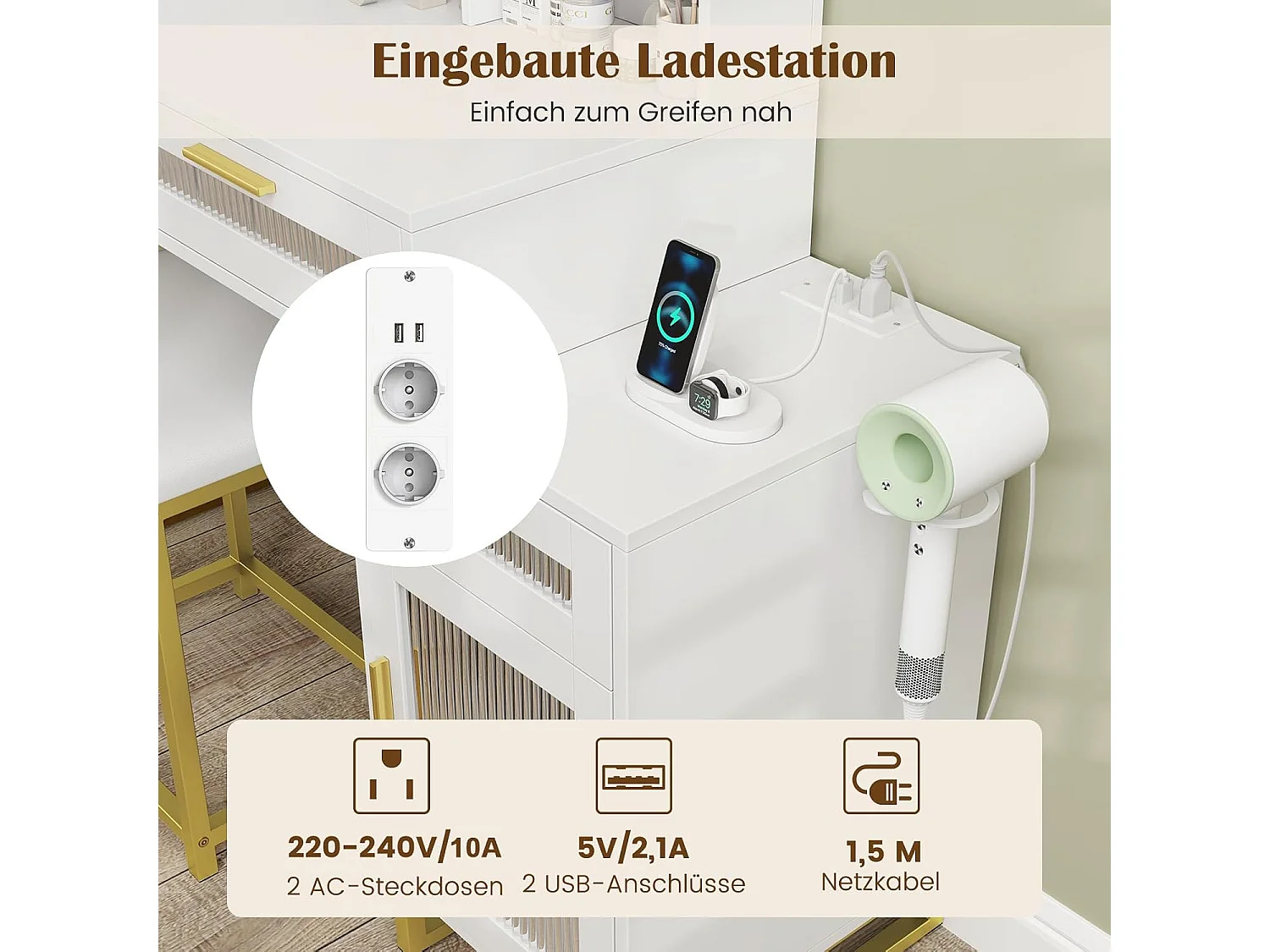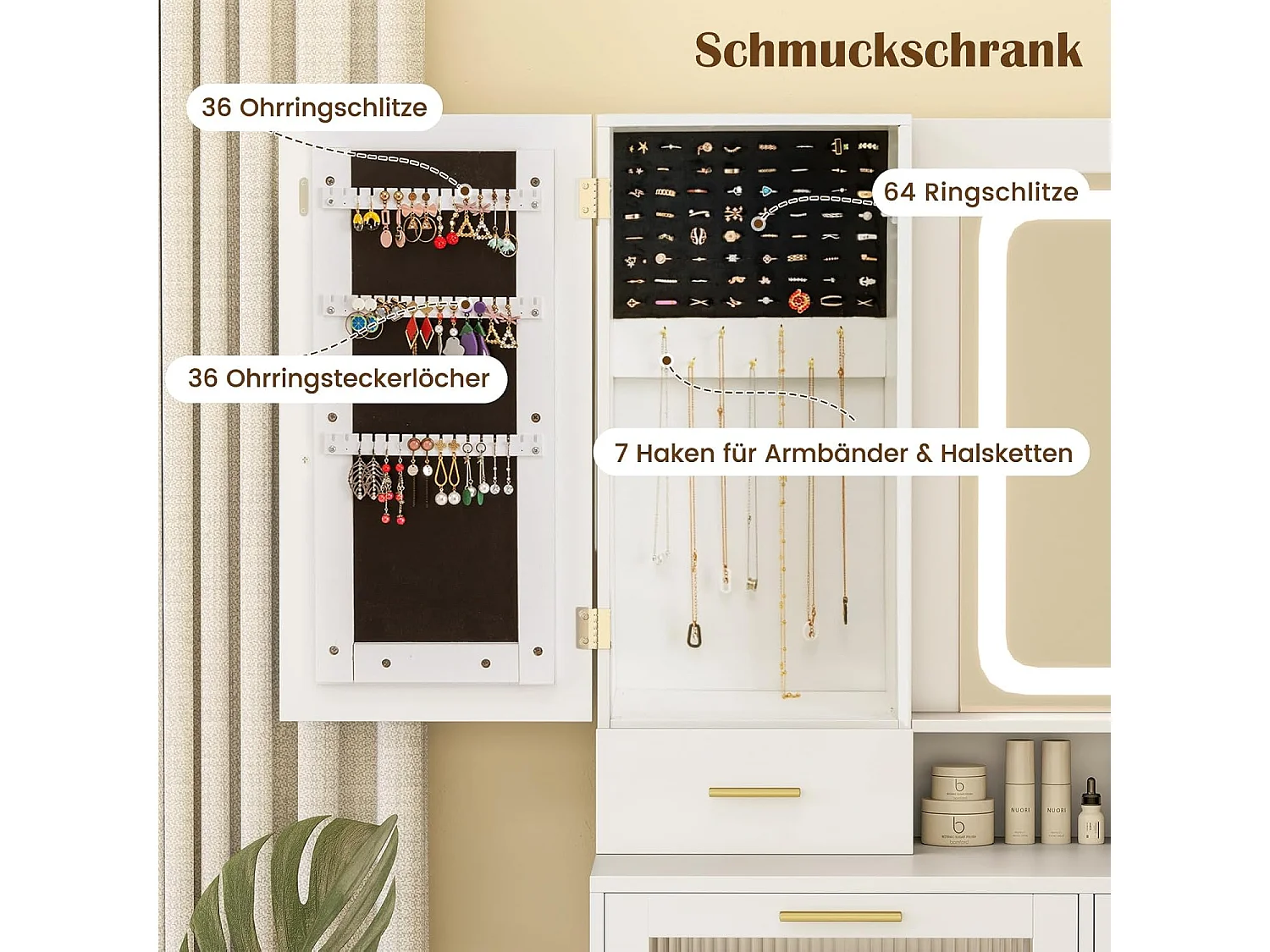 Make-uptafel met ledverlichting, kaptafel met laadstation, sieradenkast, kruk, spiegel, laden, kast, open vakken en haardrogerhouder, cosmeticatafel, witTG32076