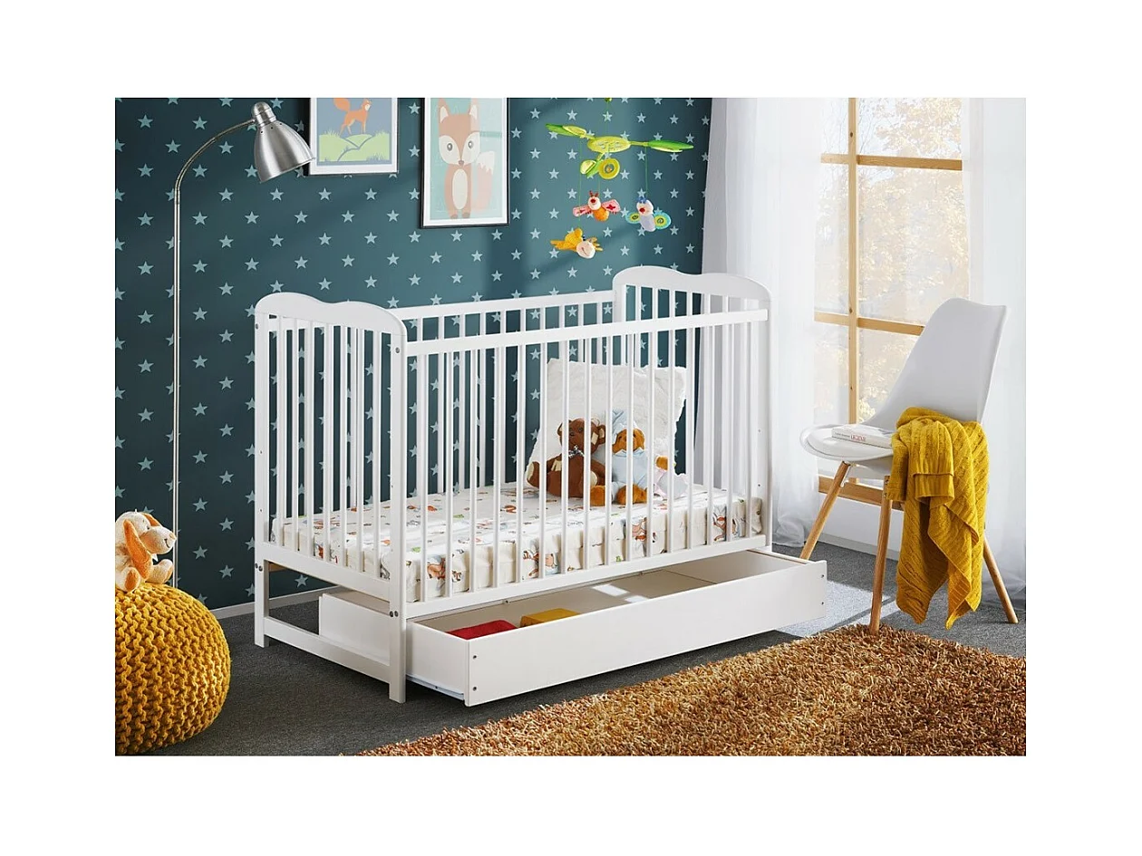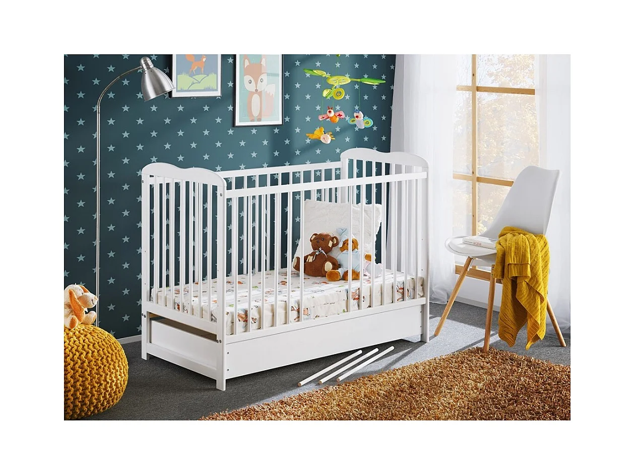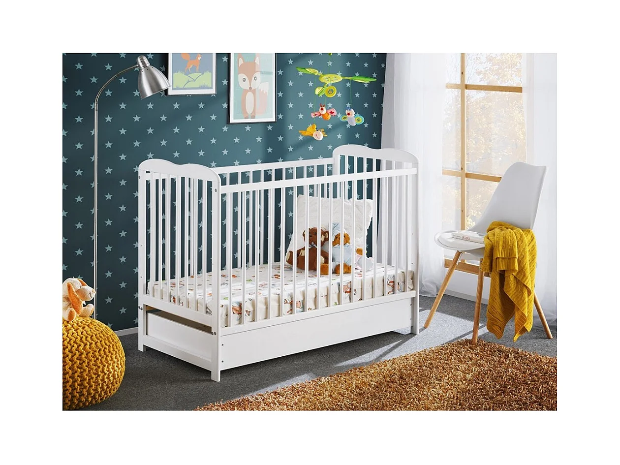 Meegroeiende babybed met lade en matras uit de LUTIN-collectie, in hoogte verstelbaar. Matte witte kleur.