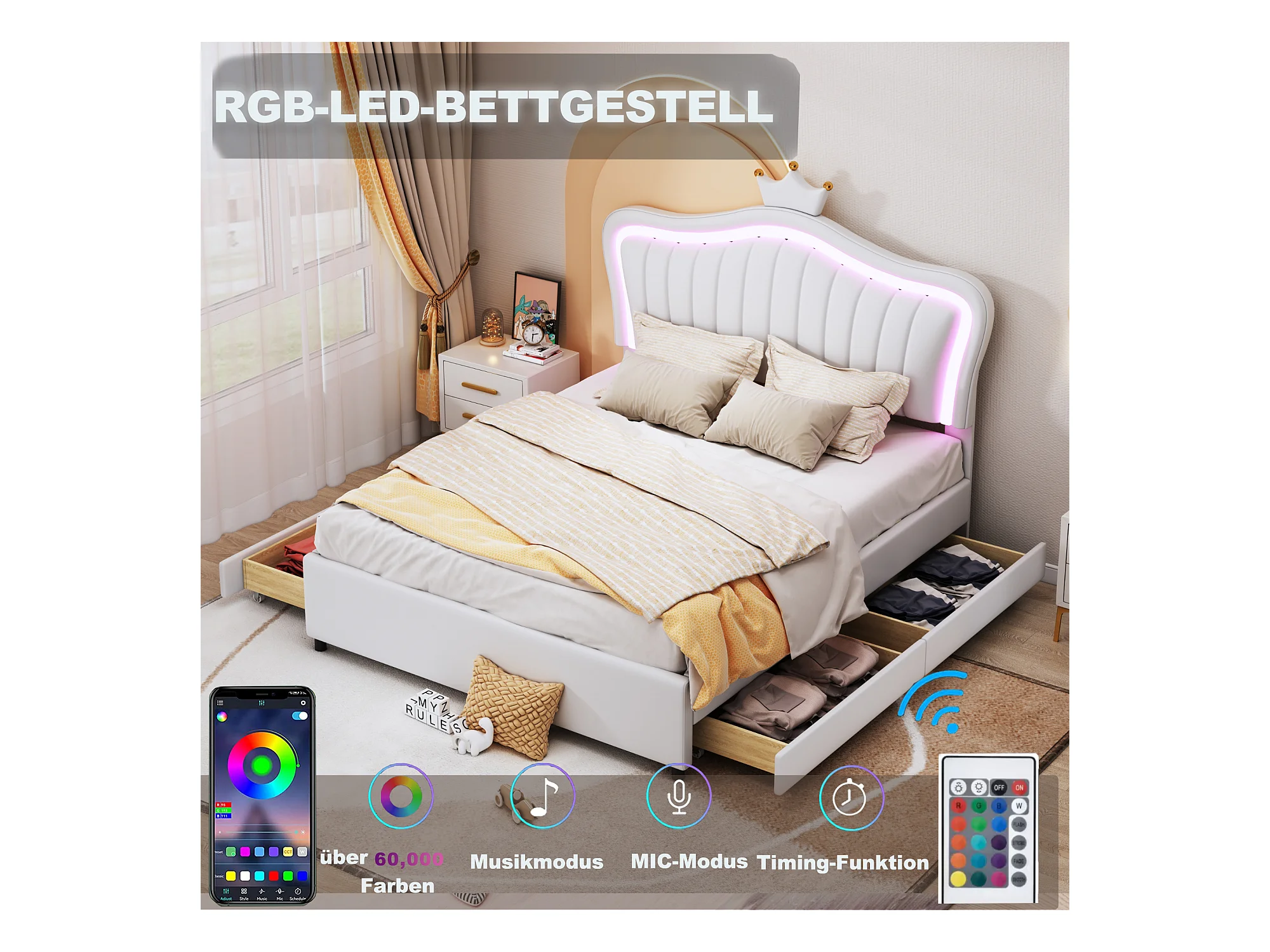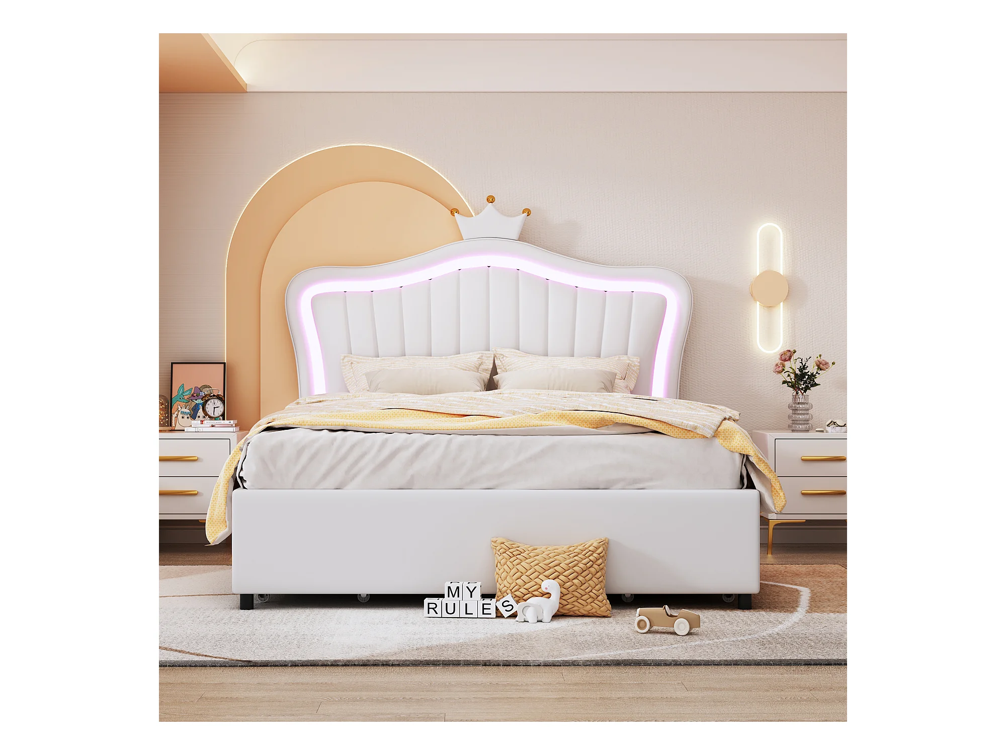 Meisjesbed 140x200 cm in wit imitatieleer met LED-verlichting – Crown hoofdbord, geïntegreerde opberglades