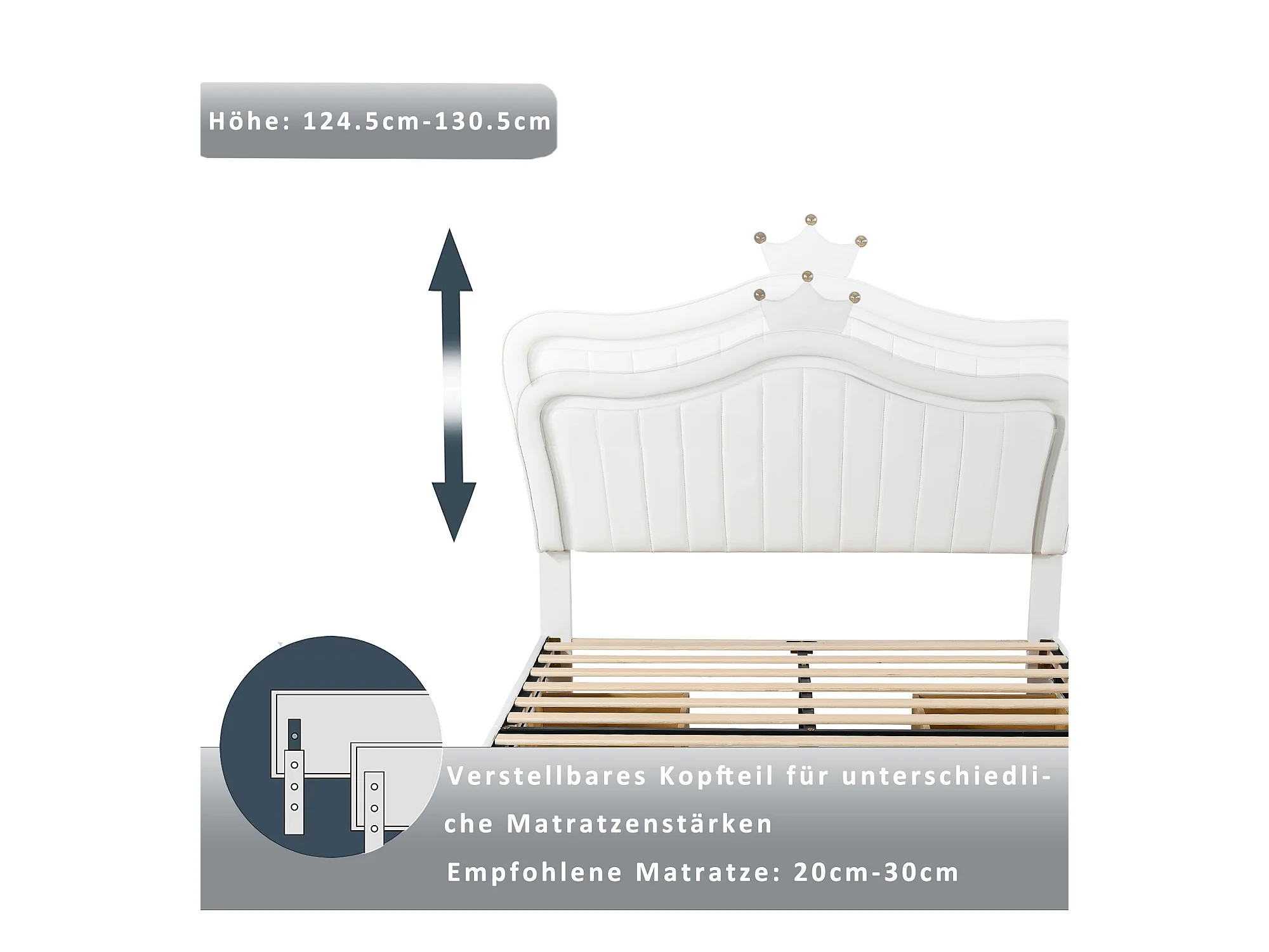 Meisjesbed 140x200 cm in wit imitatieleer met LED-verlichting – Kroonvormig hoofdeinde, hydraulische opbergbox