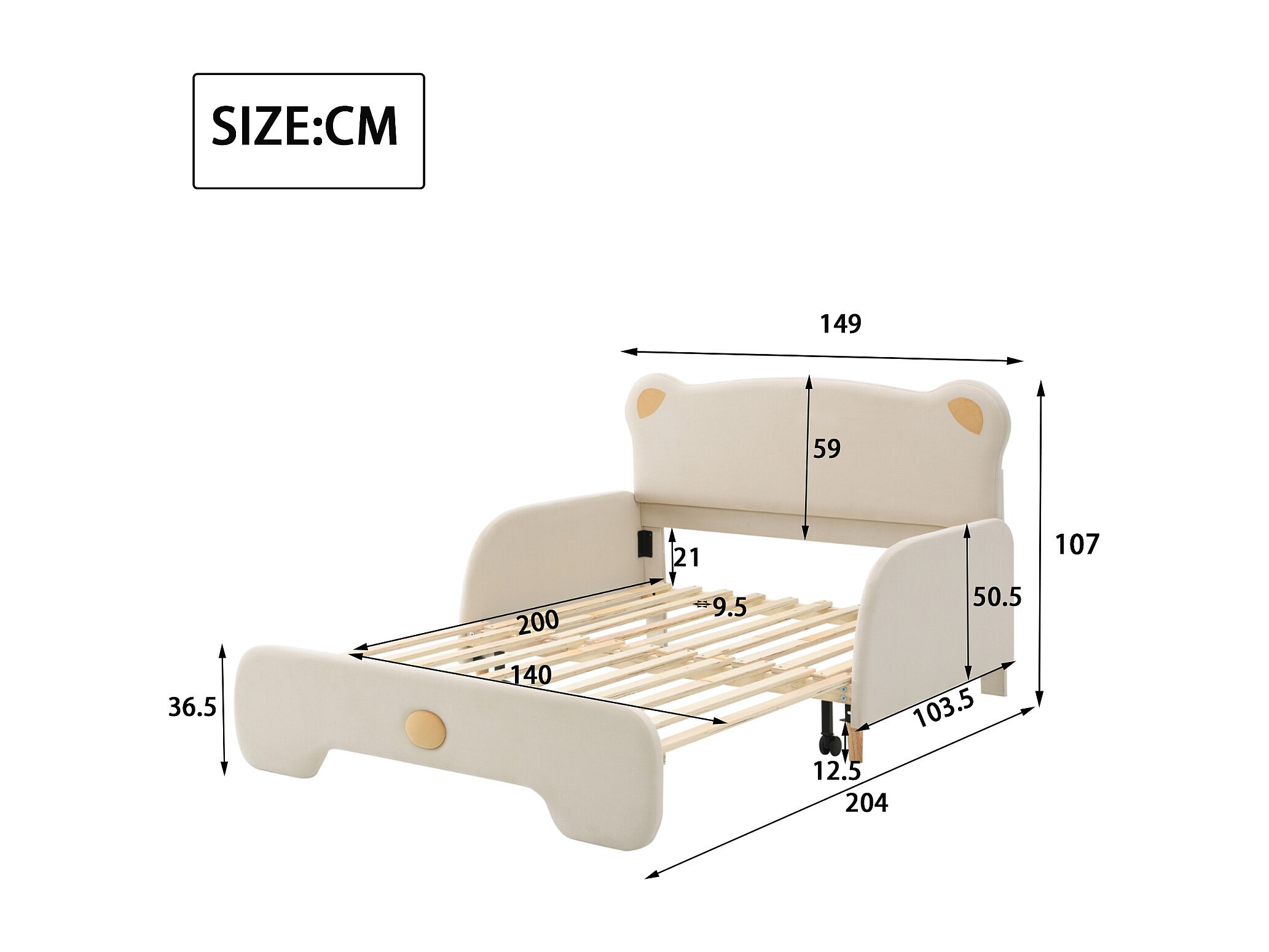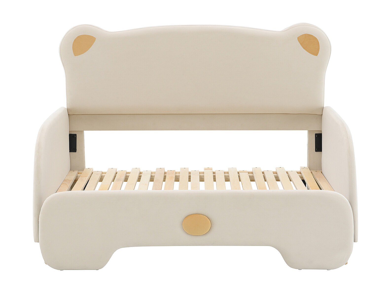 (Met matras) Tweepersoonsbed Bear, gestoffeerd, kinderbed, divan, onderschuifbed, zachte randen, houten lattenbodem, fluweel, beige, 140x110/200cm