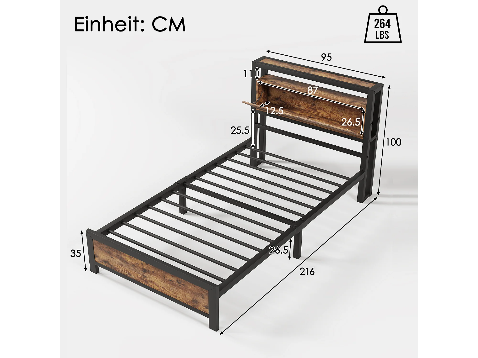 Metalen bed met verstelbaar hoofdeinde, metalen en houten frame, met opbergruimte onder het bed, 90x200 cm, grijs (afmetingen: 100x216x95 cm)