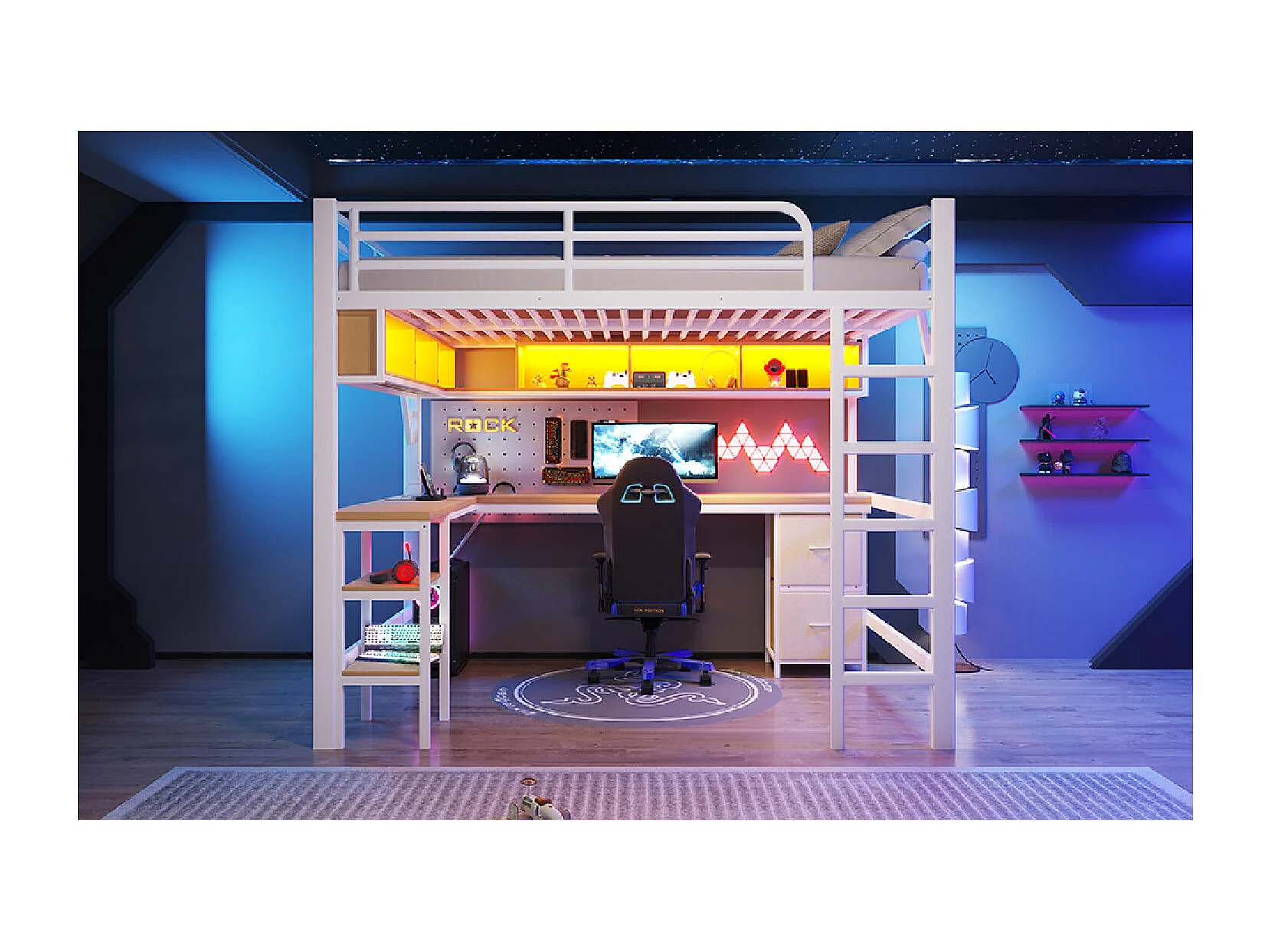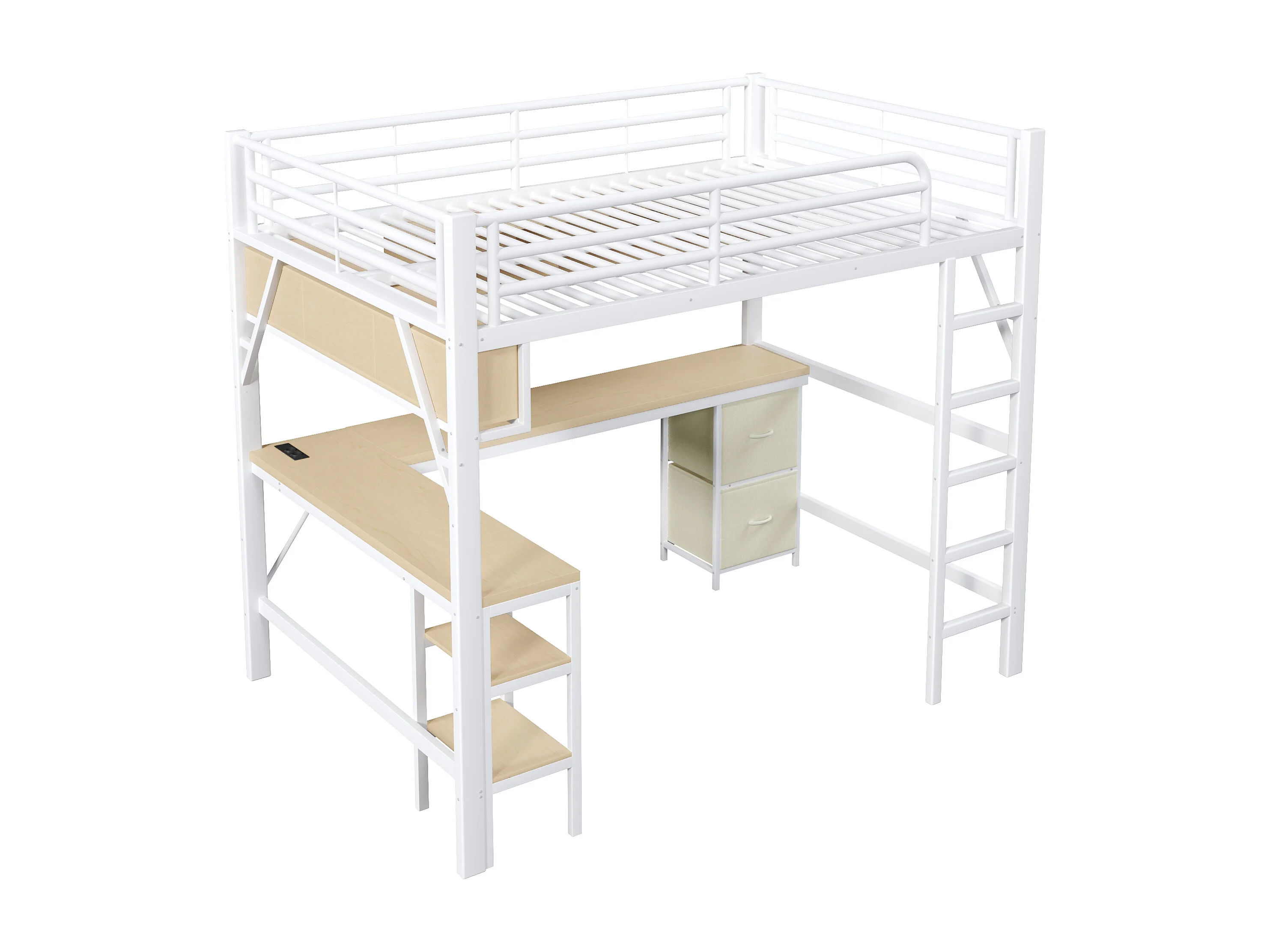 Metalen hoogslaper van 140x200 cm met bureau, USB- en LED-aansluitingen en 2 lades - wit
