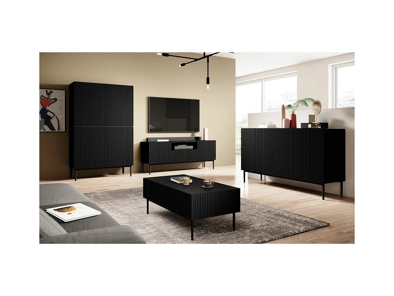 Meuble TV 2 vouwdeuren 1 lade noir met zwart bont 200x45 cm