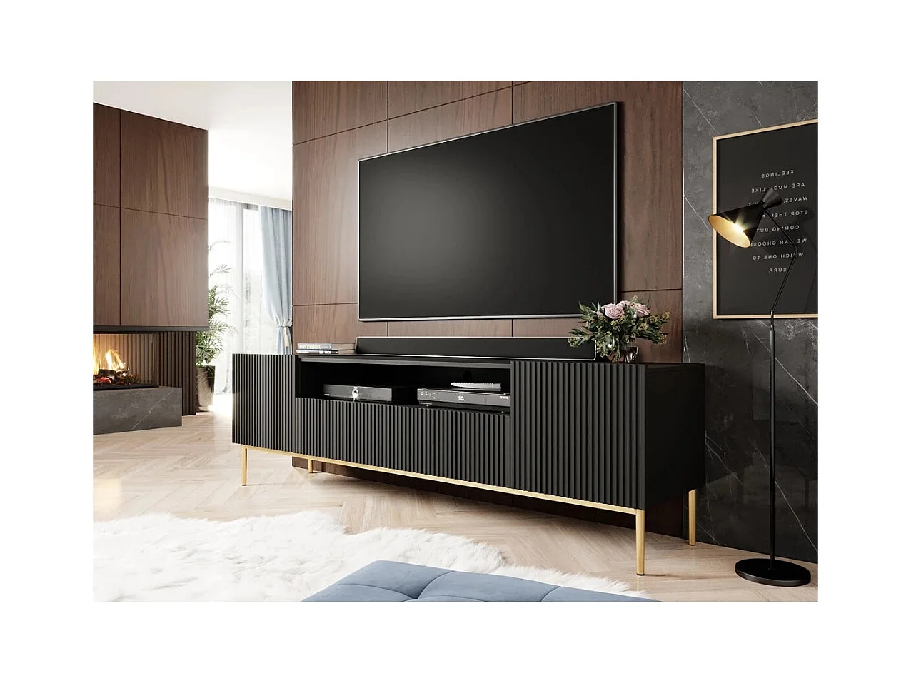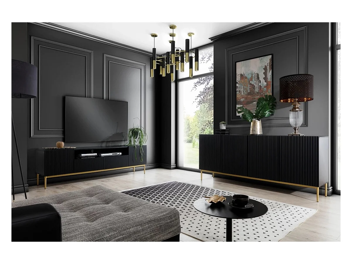 Meuble TV 2 vouwdeuren 1 zwarte lade met gouden metalen pied 200x45 cm