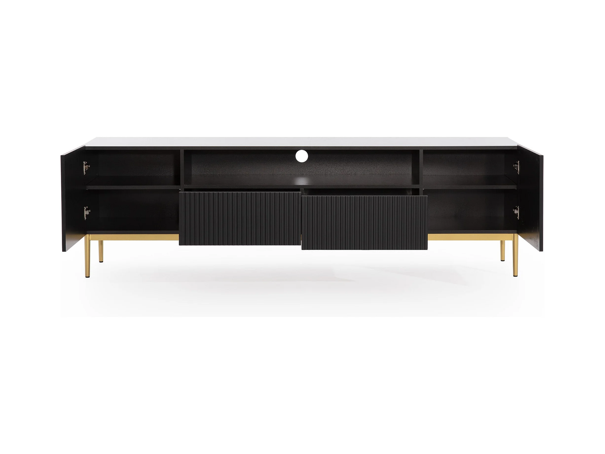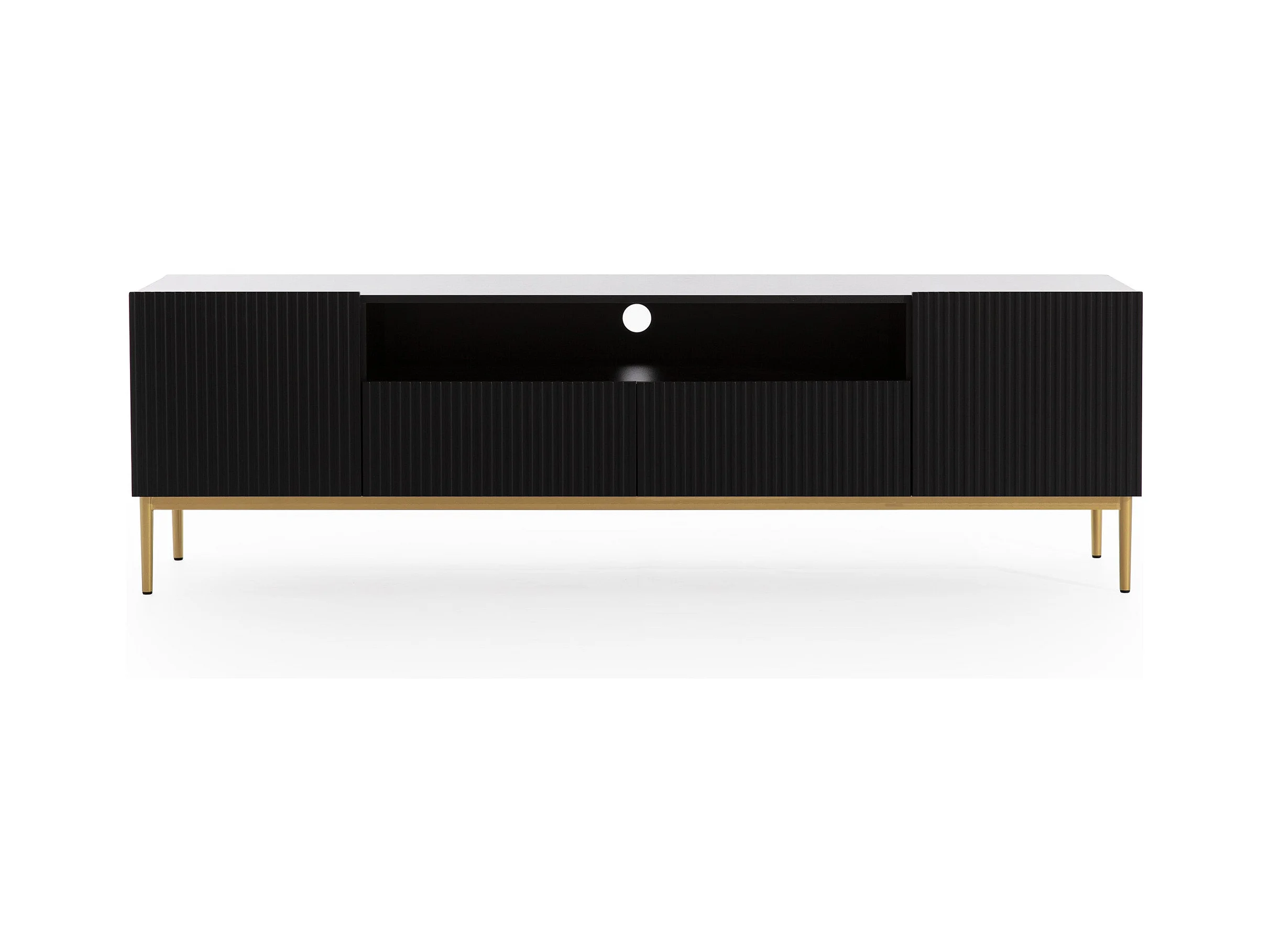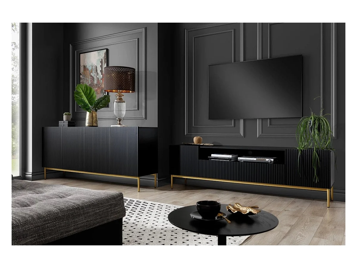 Meuble TV noir met 2 deuren en 2 lades met goud metalen voet 200x45 cm