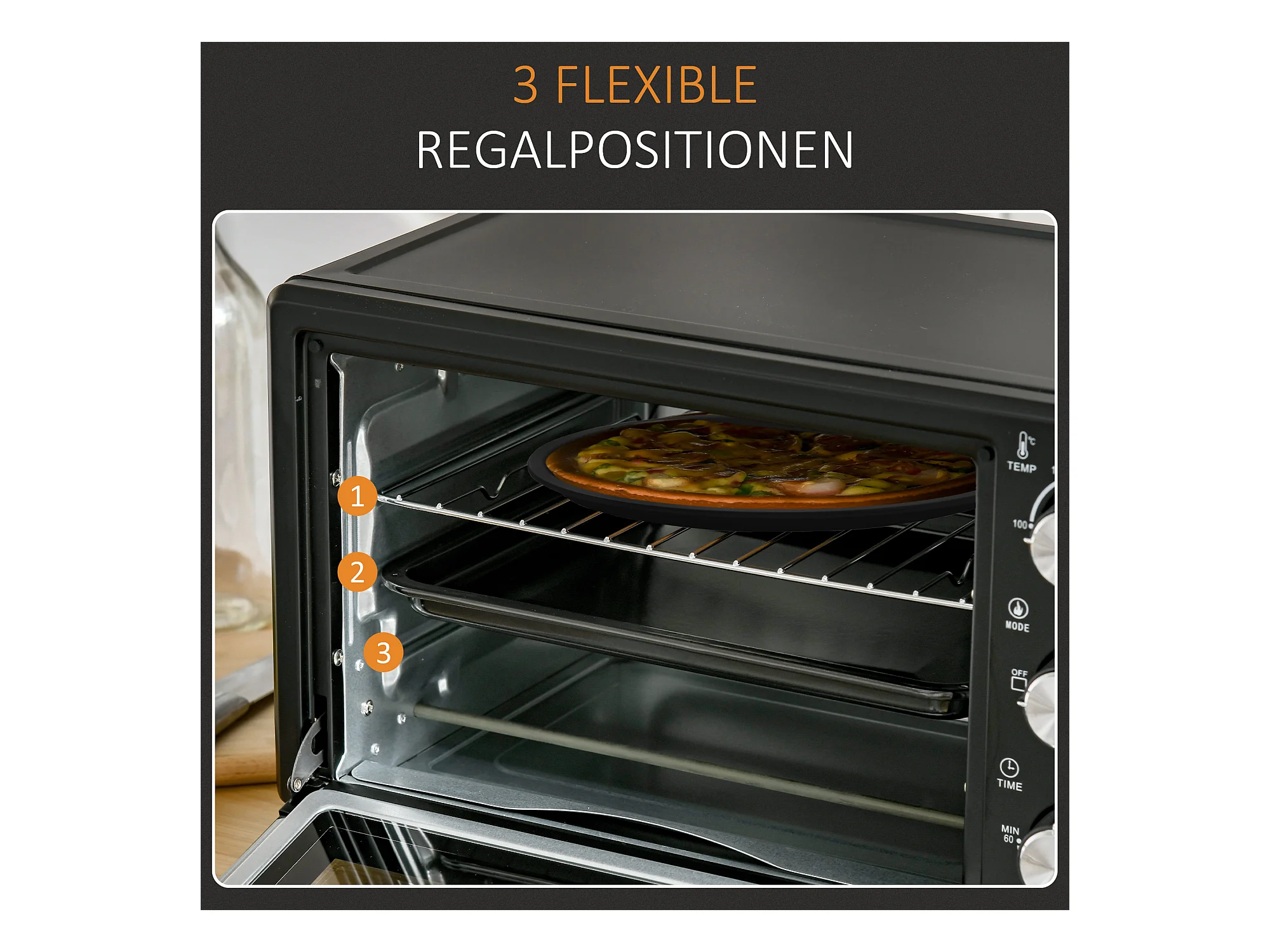 Mini vier 28L 2600W met 60 min minuut, 2 verwarmingsplaten, grill en kookplaat, vier met pizza met grill en mietettes (48,6x36,3x33cm)