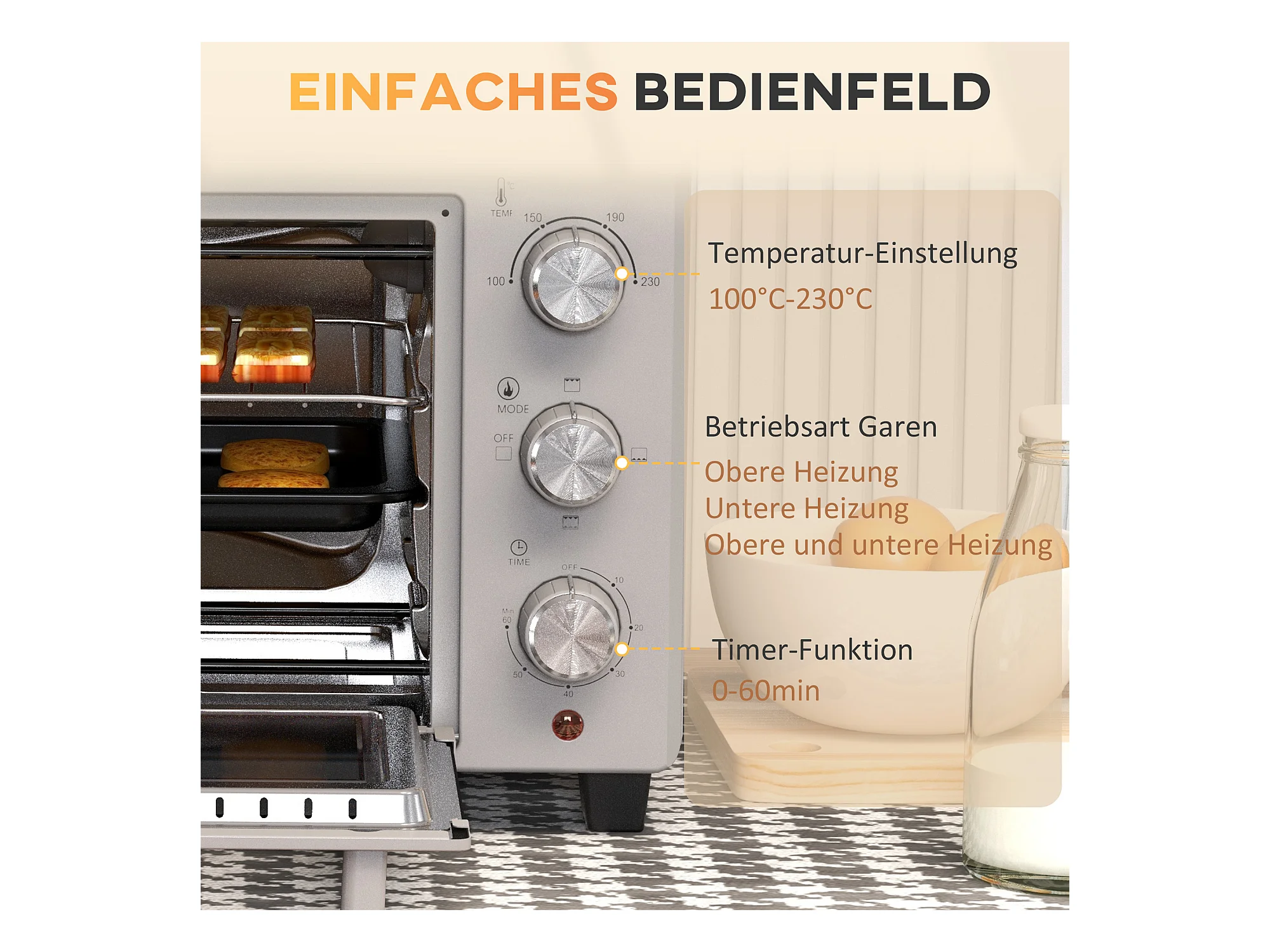 Mini four électrique 9L, temperatuur regelbaar 100-230°C, met minuterie 60 min, grille en plaque de cuisine, metaal, argenté (36,5x26x22cm)