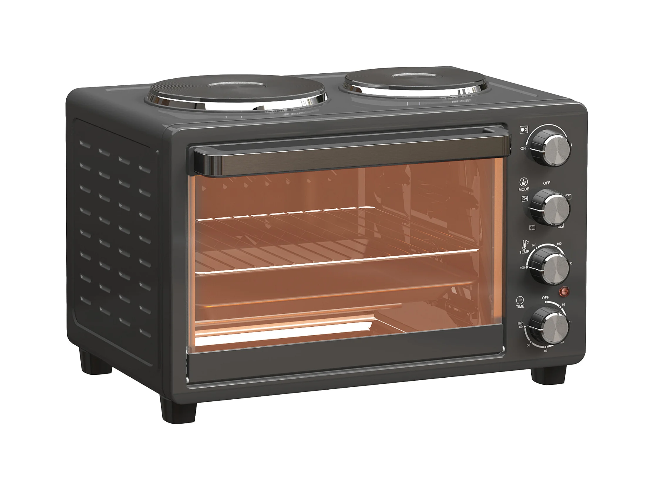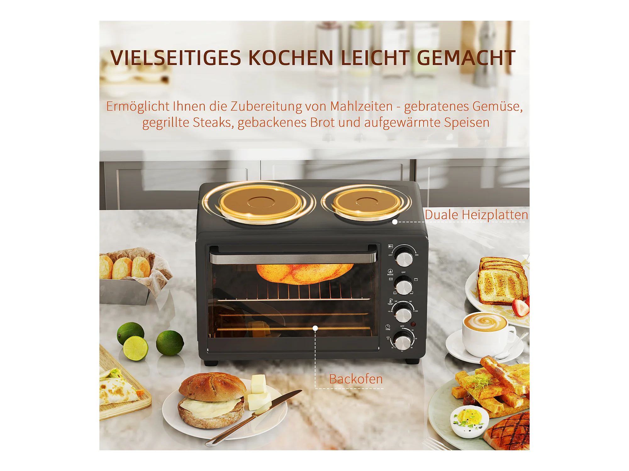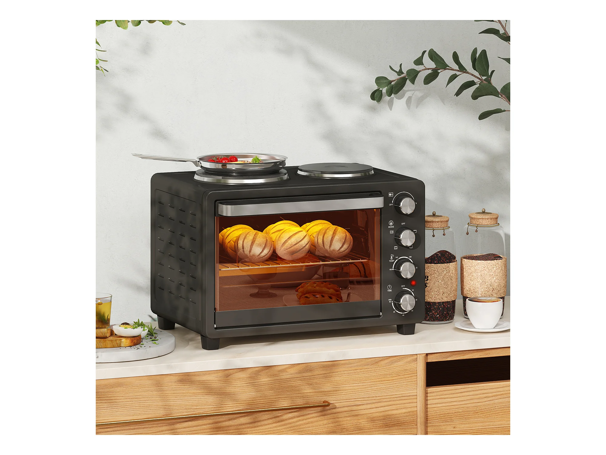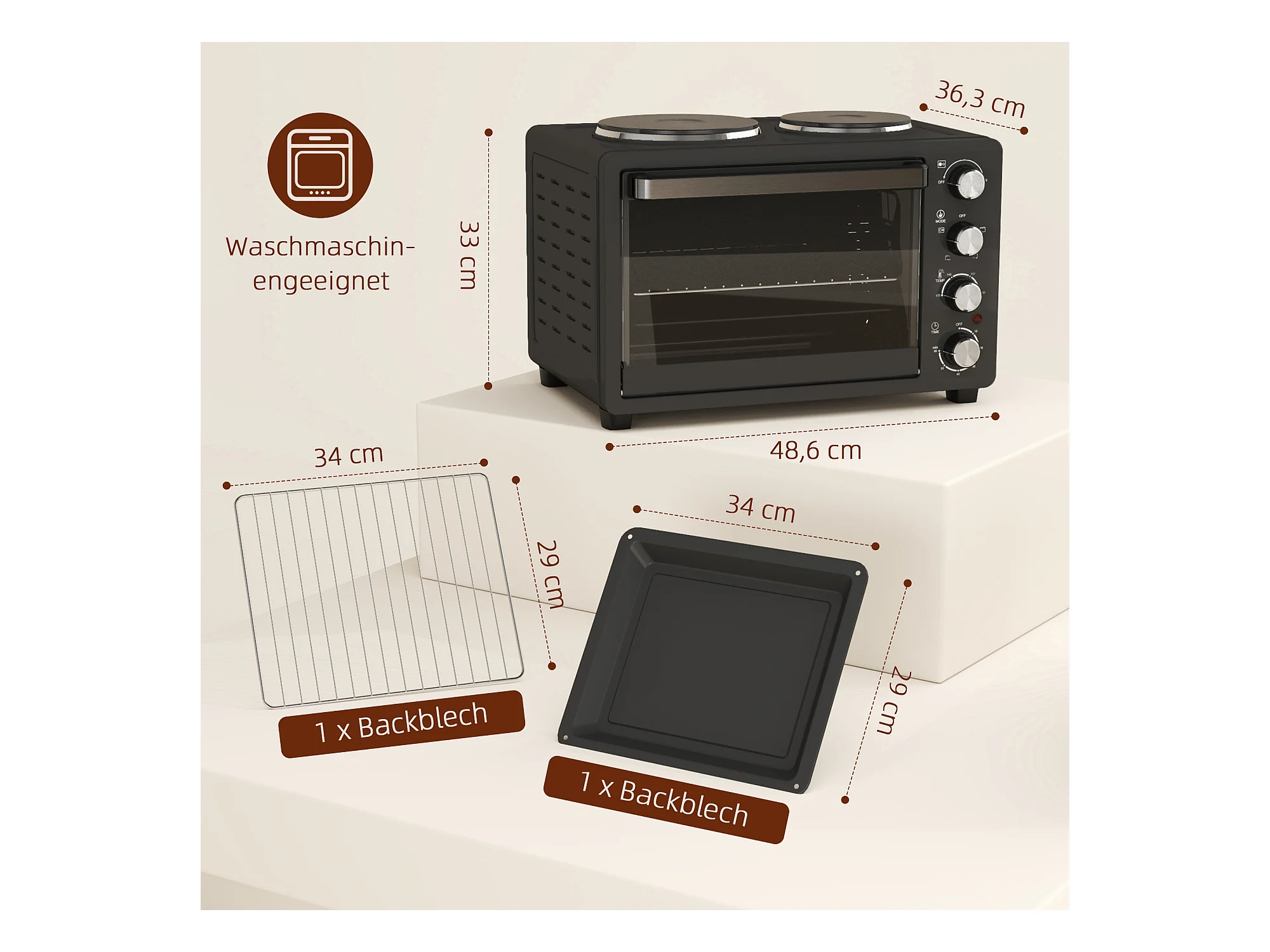 Mini vier 28L 2600W met 60 min minuut, 2 verwarmingsplaten, grill en kookplaat, vier met pizza met grill en mietettes (48,6x36,3x33cm)
