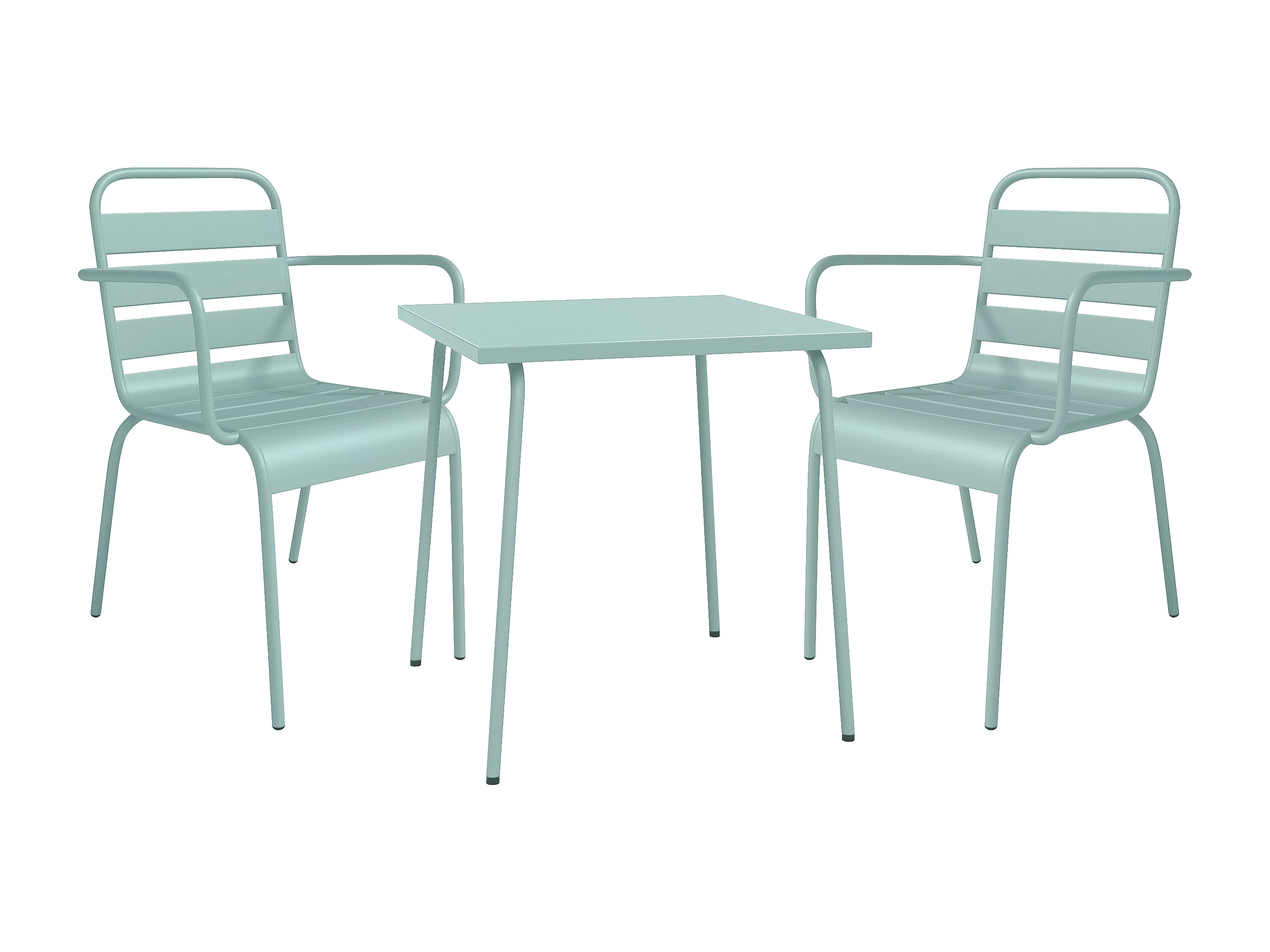 Tuineethoek van metaal - een tafel van 70 cm breed en 2 stapelbare fauteuils - Amandel groen - MIRMANDE van MYLIA