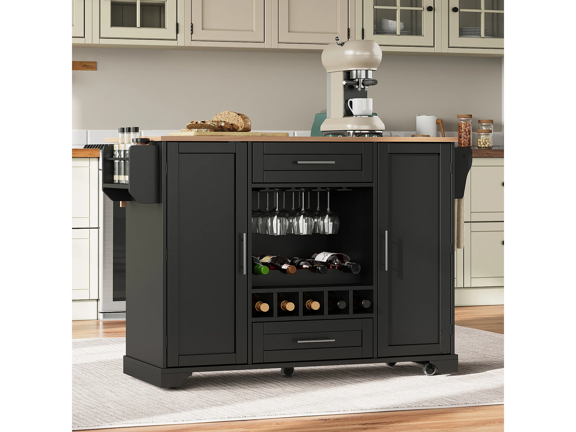 Mobiel keukeneiland - uitschuifbaar aanrechtblad - met wijnrek en handdoekhouder - met 2 lades en 2 deuren - MDF - Zwart
