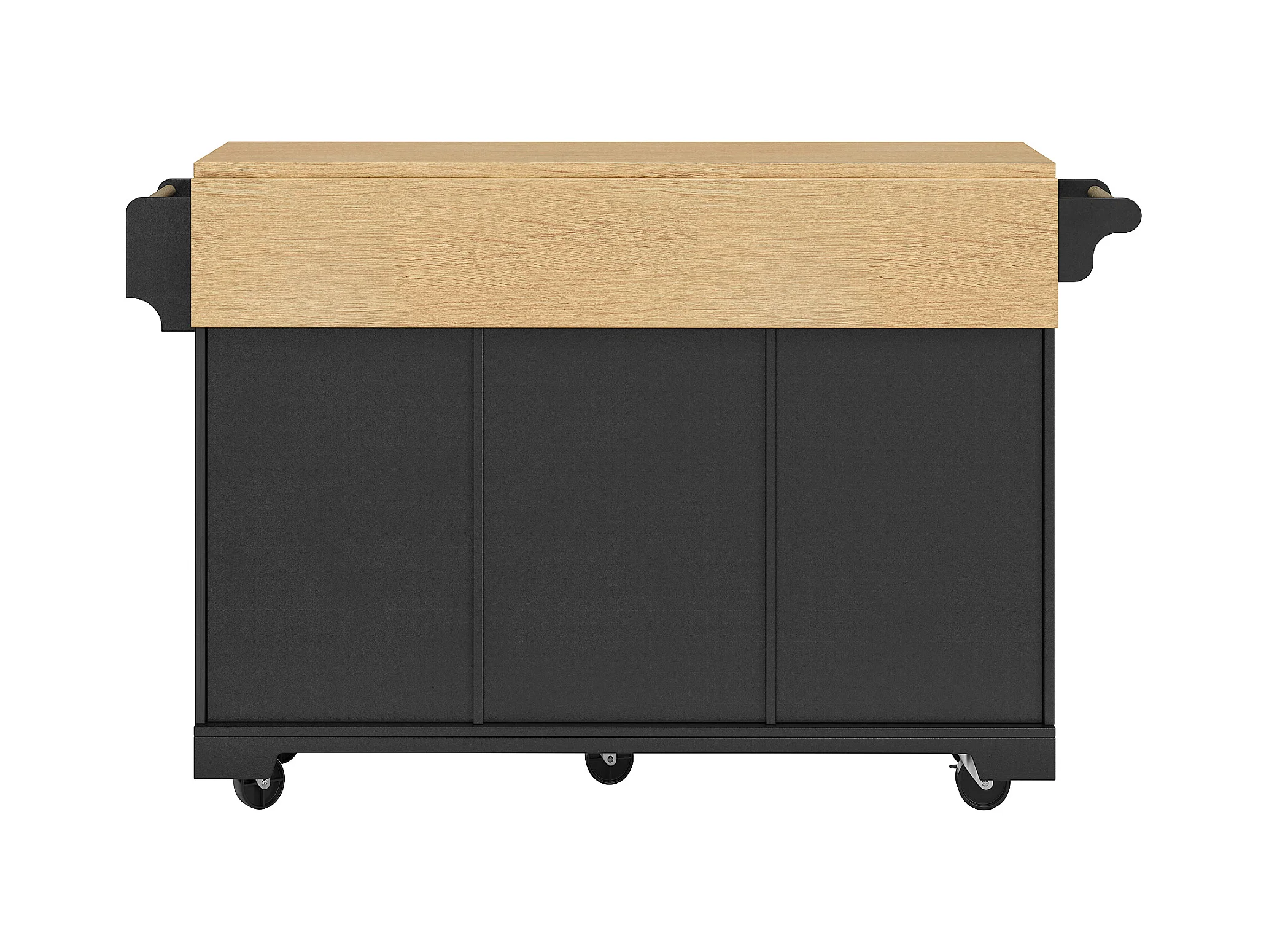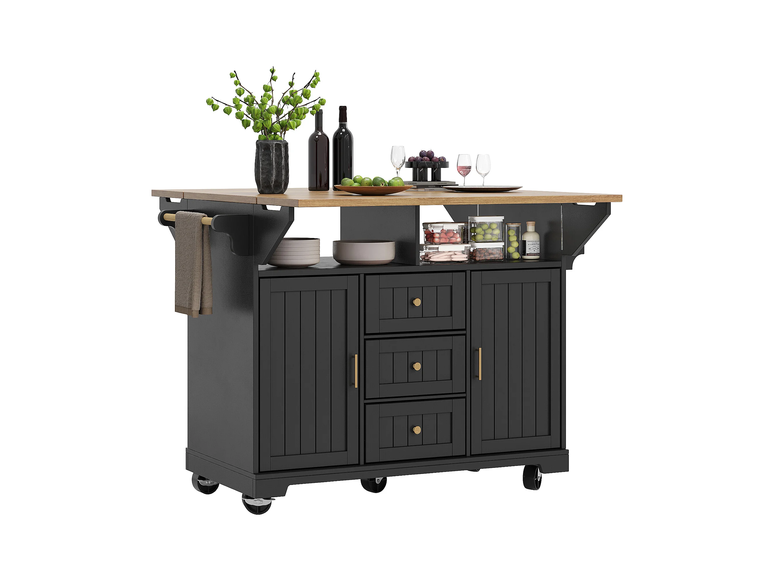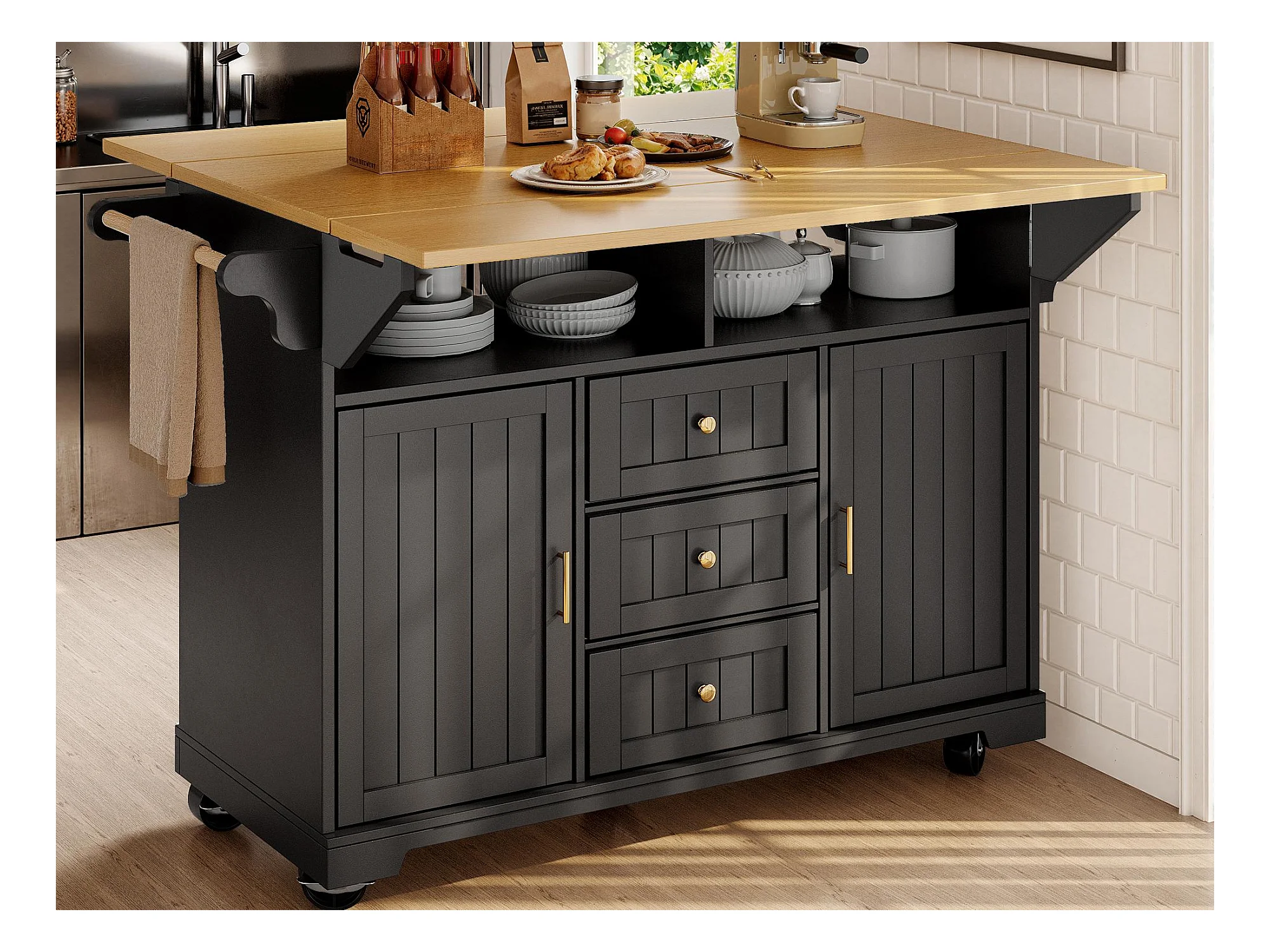 Mobiel keukeneiland - ​​Uitschuifbaar werkblad​​ - 2 deuren en 3 lades - Open planken - ​​Met handdoekenrek​​ - MDF - Zwart