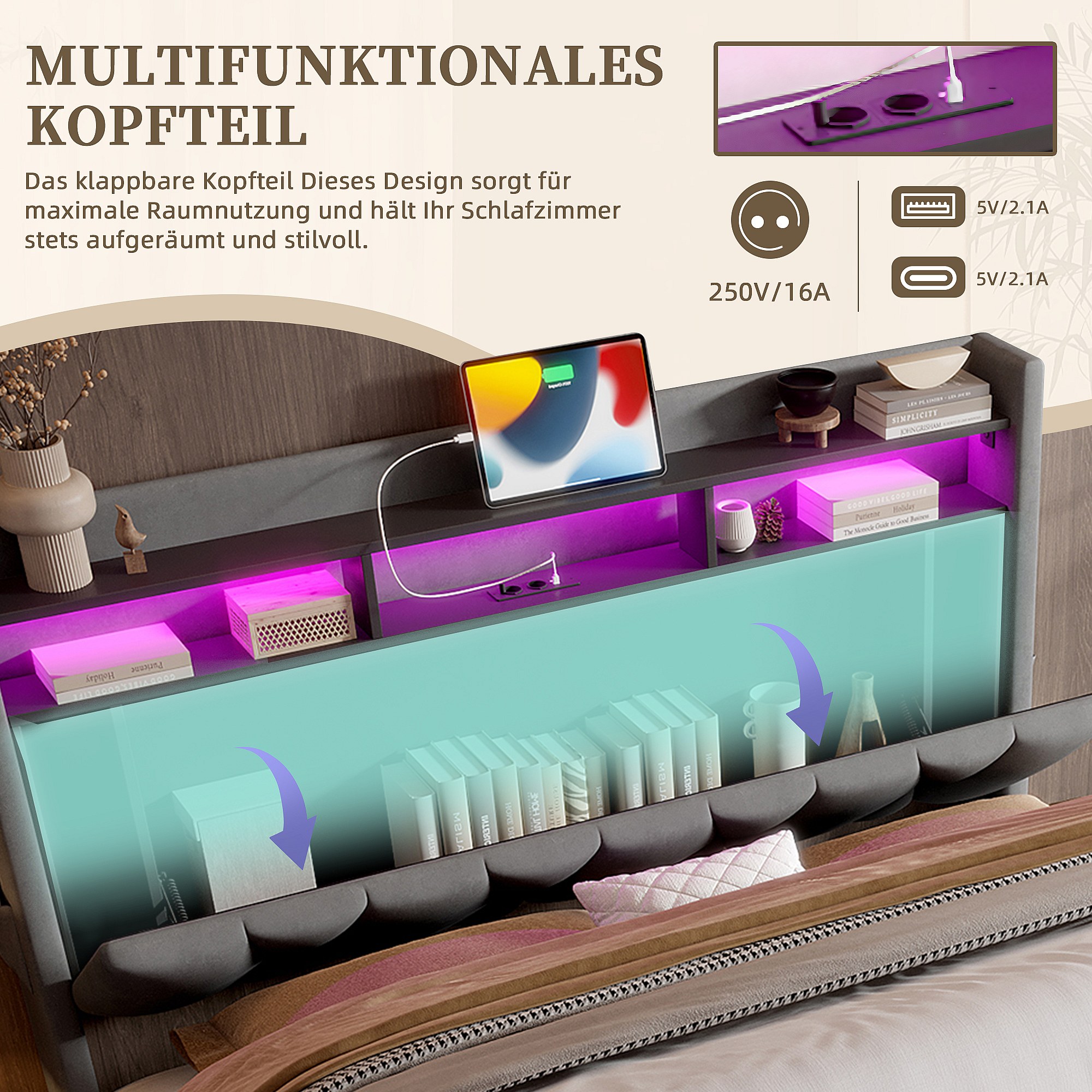Tweepersoonsbed 160×200 cm, met LED- en USB Type-C-poorten, metalen frame en 4 lades, in beige fluweel (zonder matras)