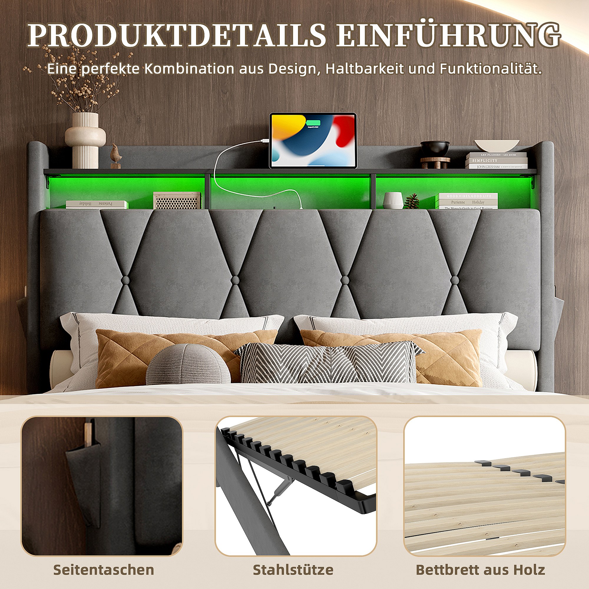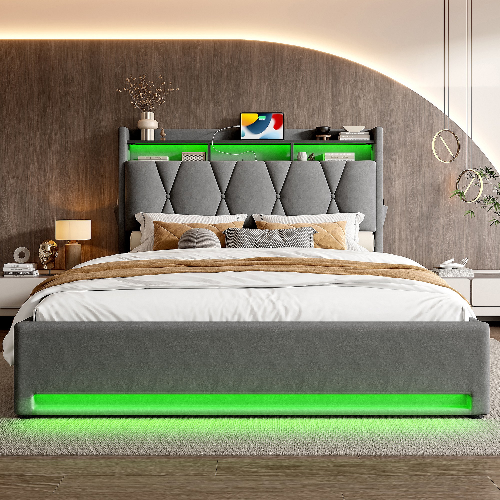 Modern bed met LED-hoofdbord en opbergruimte, grijs fluwelen frame, 160x200 cm (146x221x150 cm)