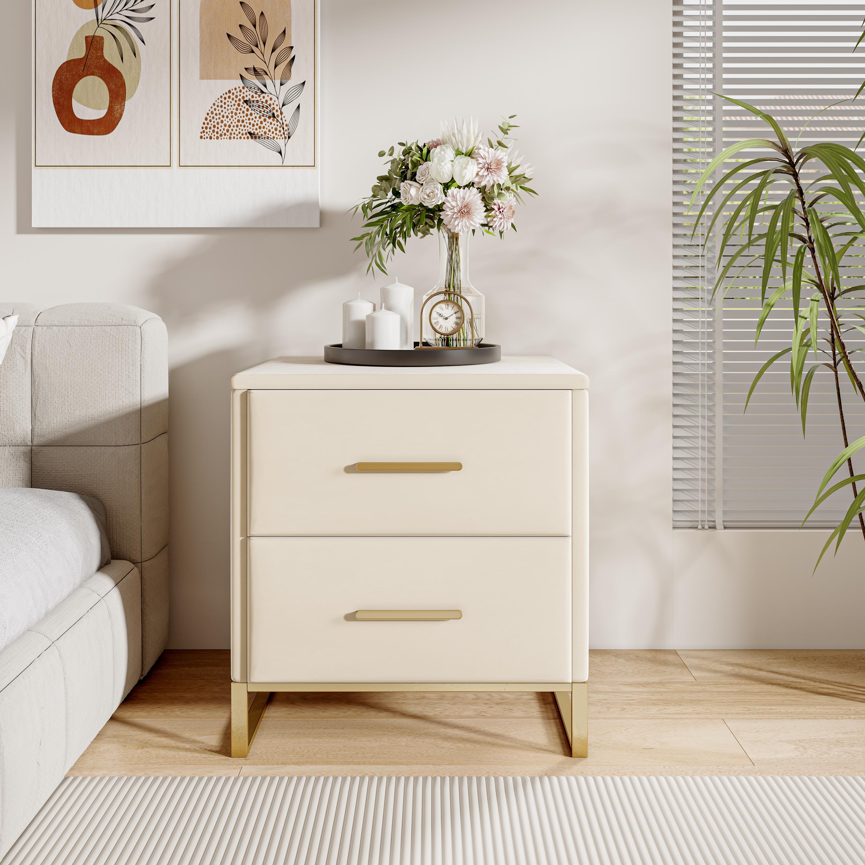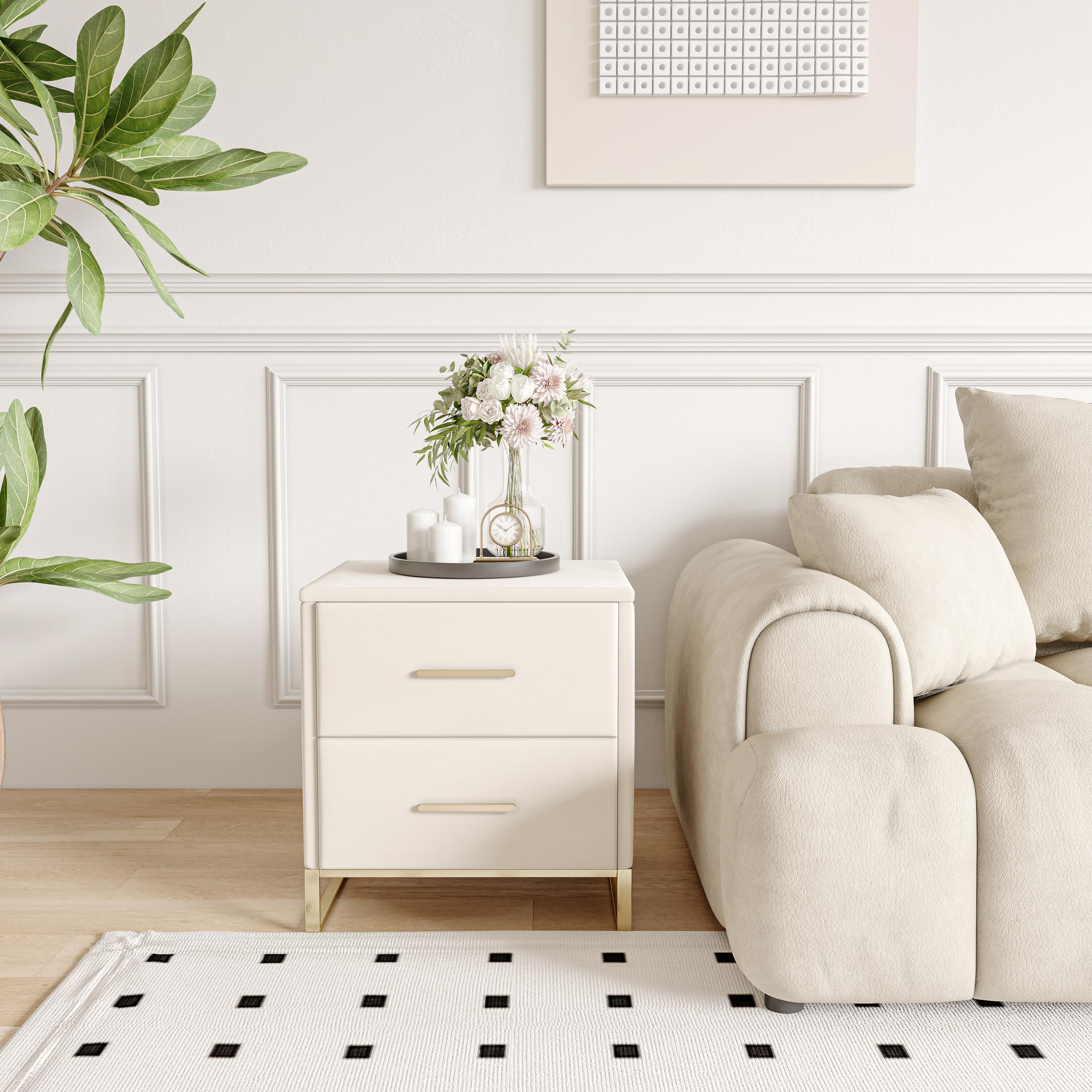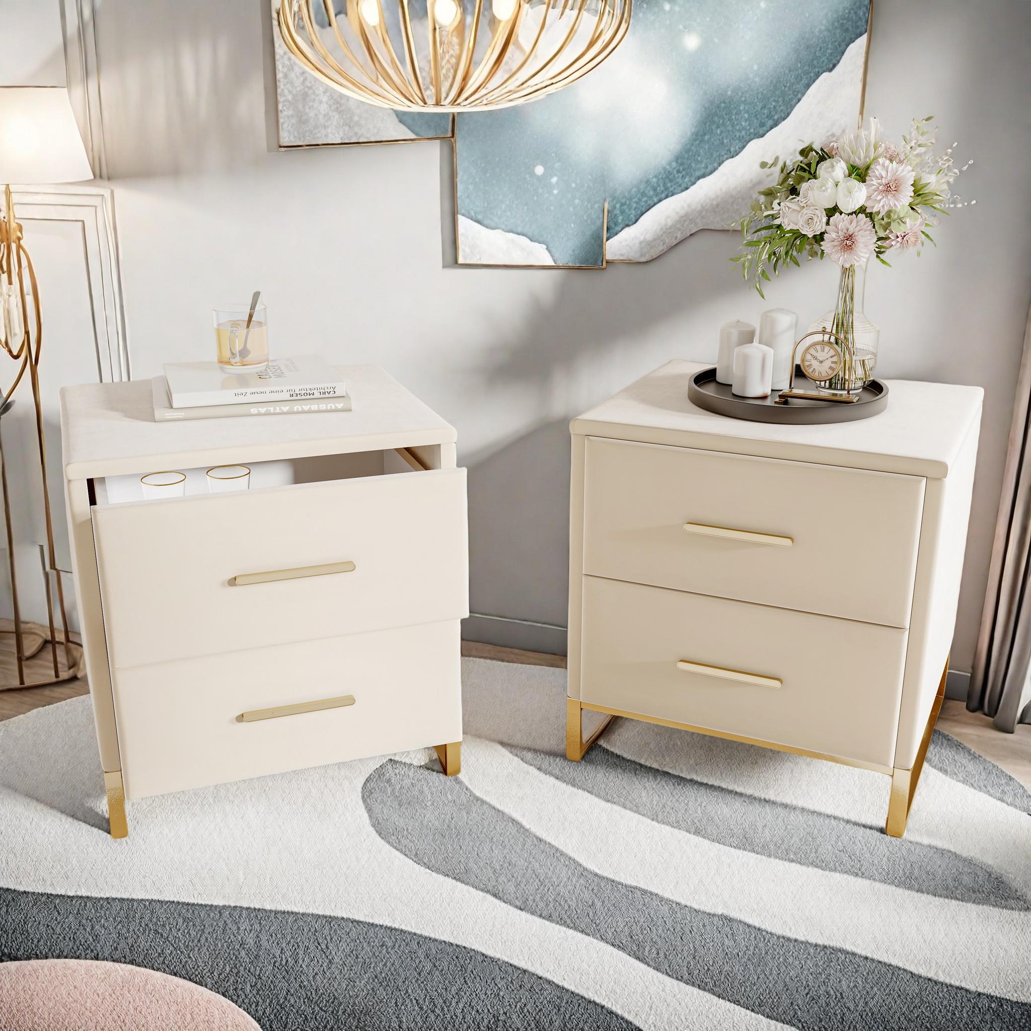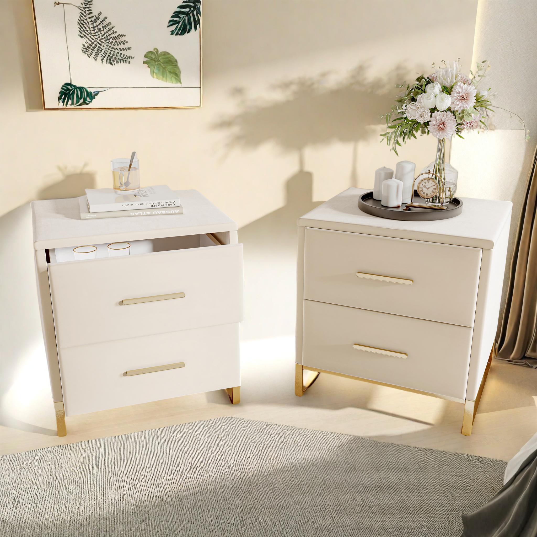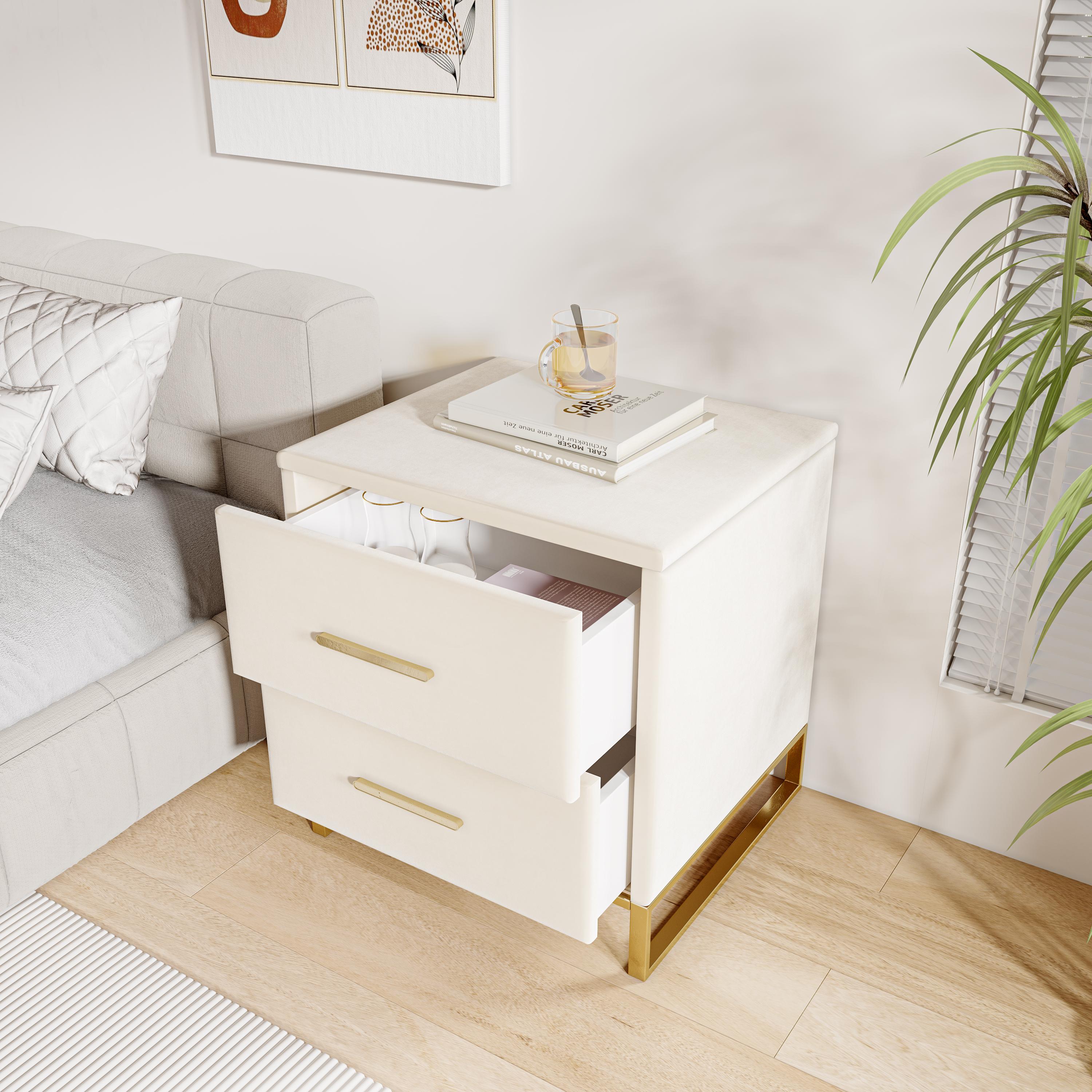 Modern beige nachtkastje met twee lades en goudkleurige metalen poten, fluwelen stof