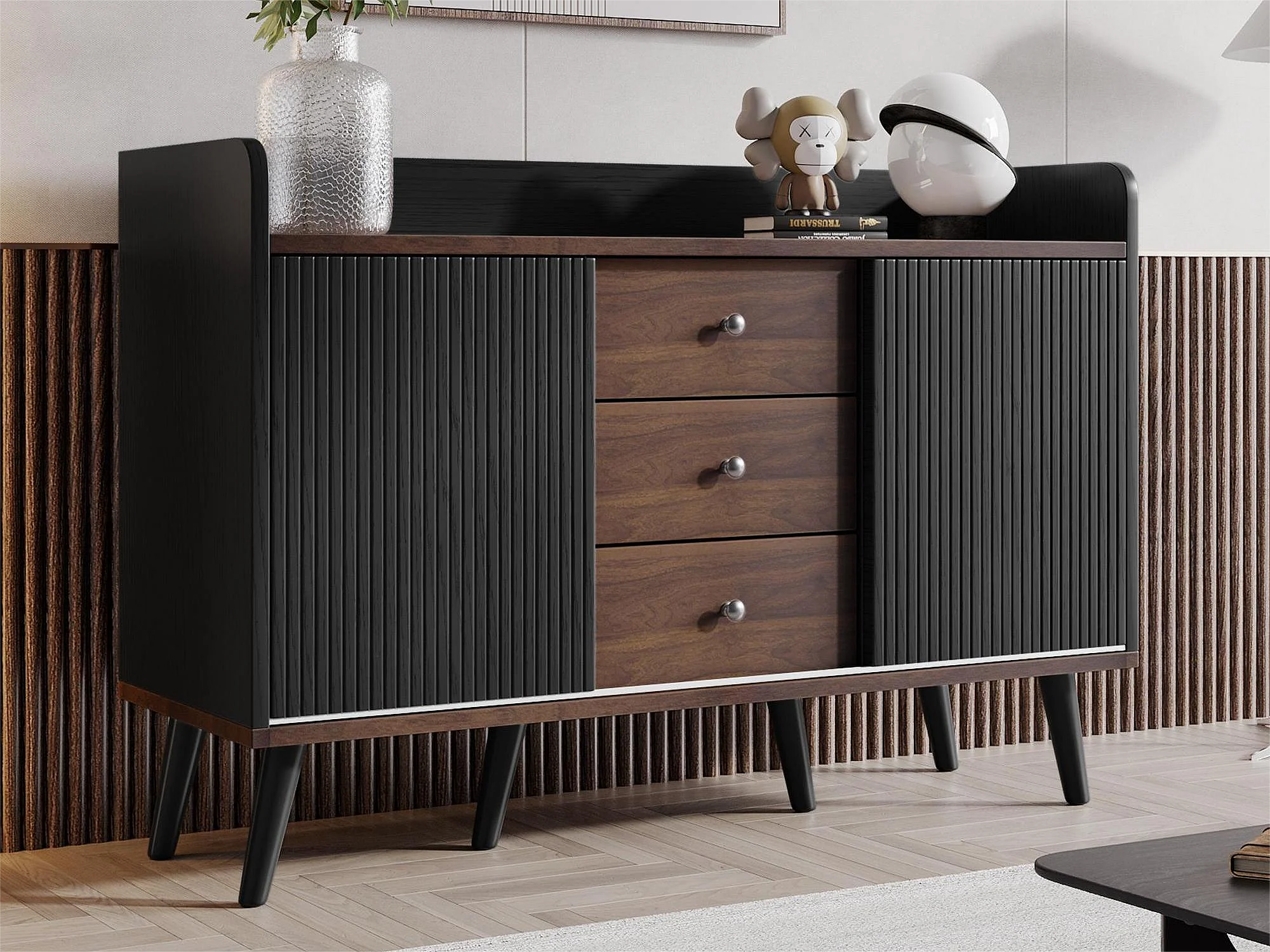 Modern dressoir met 2 deuren en 3 laden - opbergplank - prachtige nerf - kleur zwart en bruin