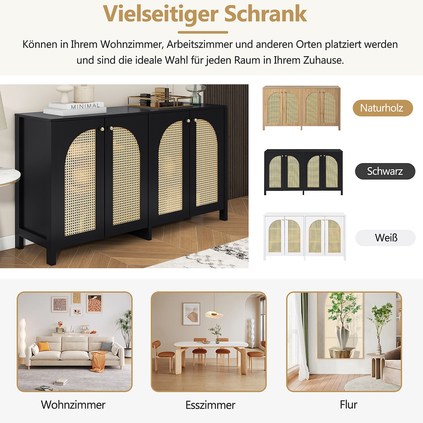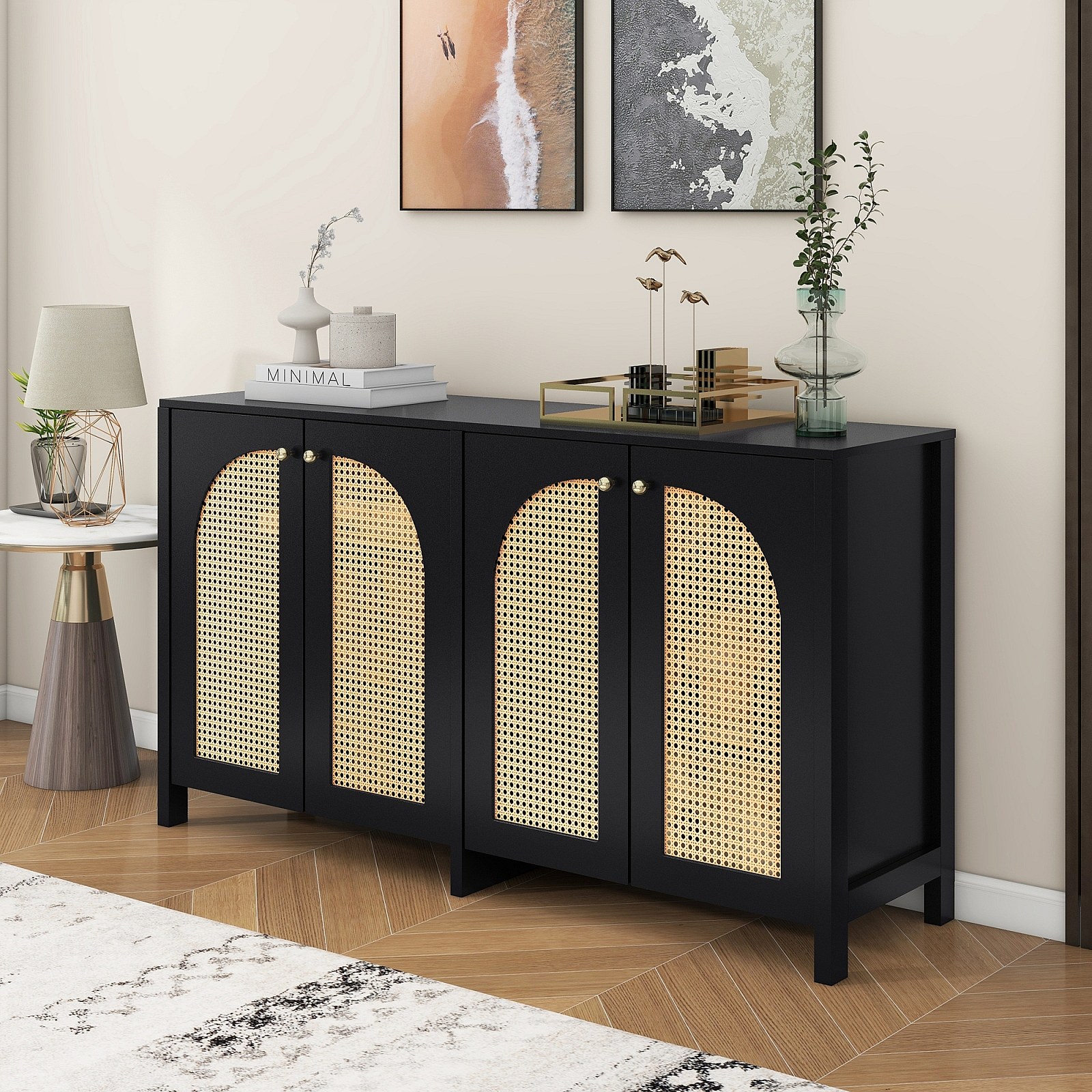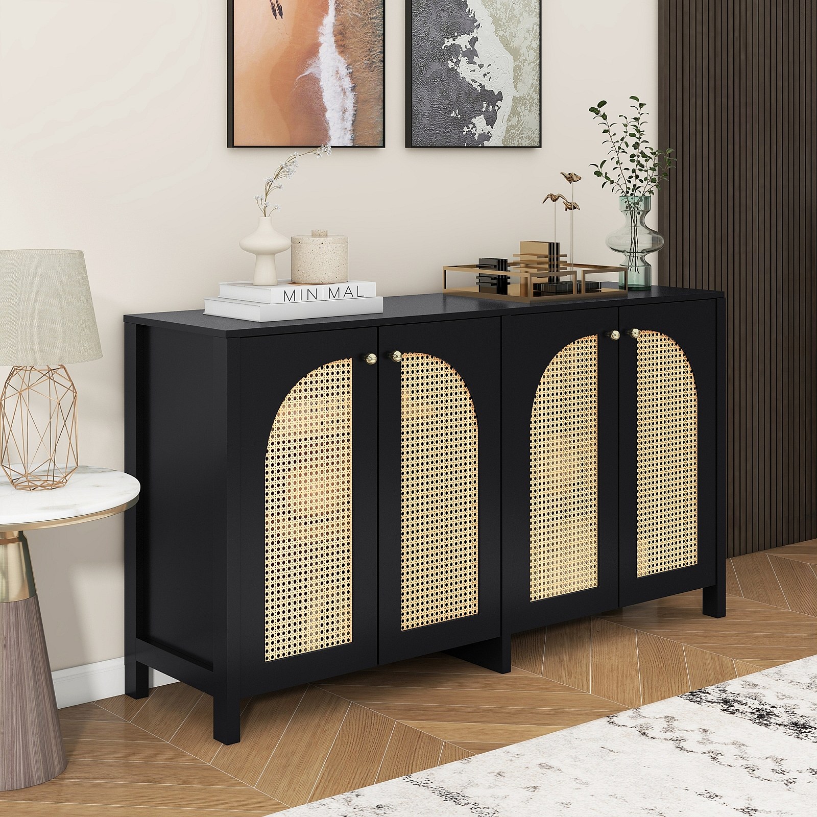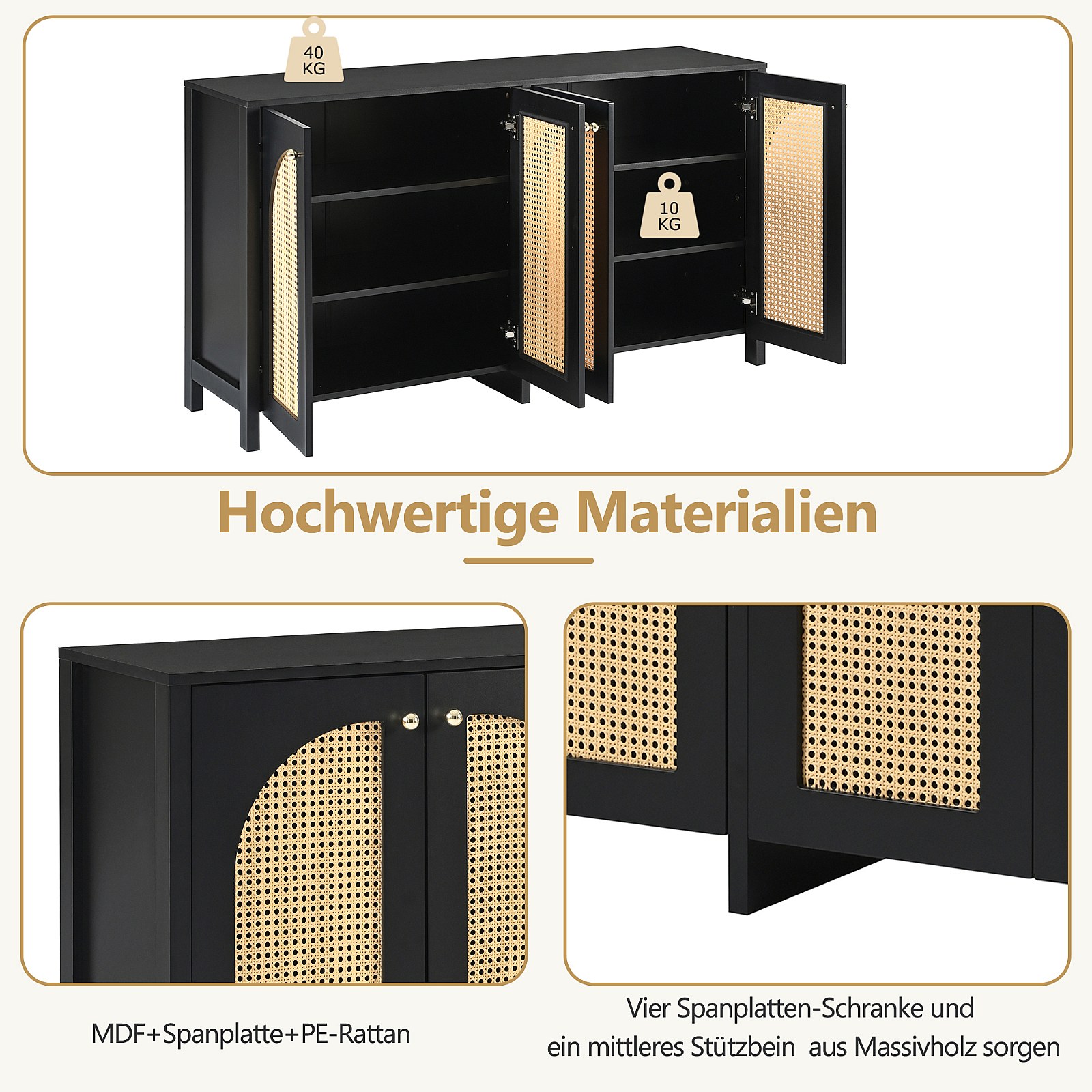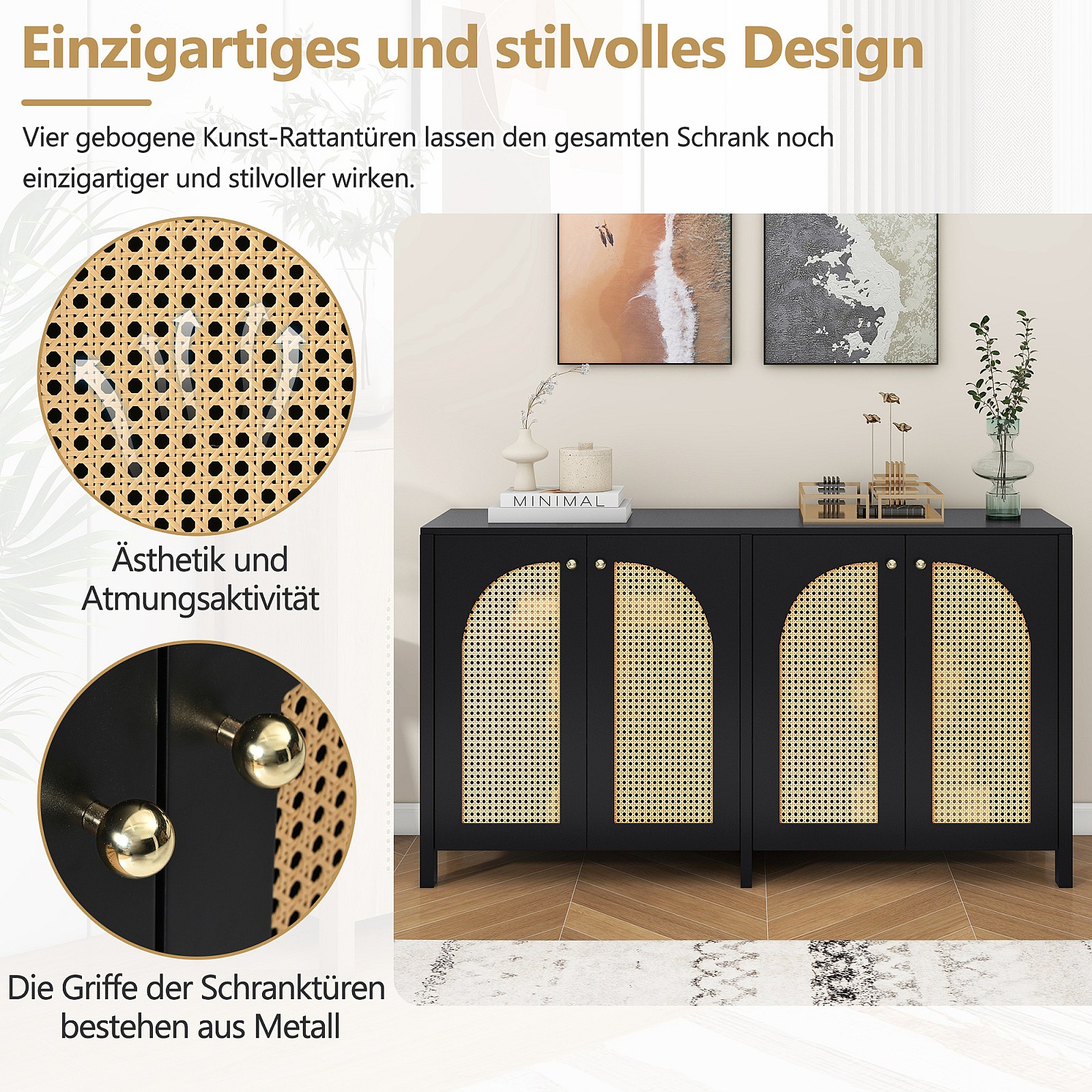 Modern minimalistisch 4-deurs rotan dressoir met metalen handgrepen - Praktisch meubilair voor eetkamer, woonkamer en keuken - Zwart