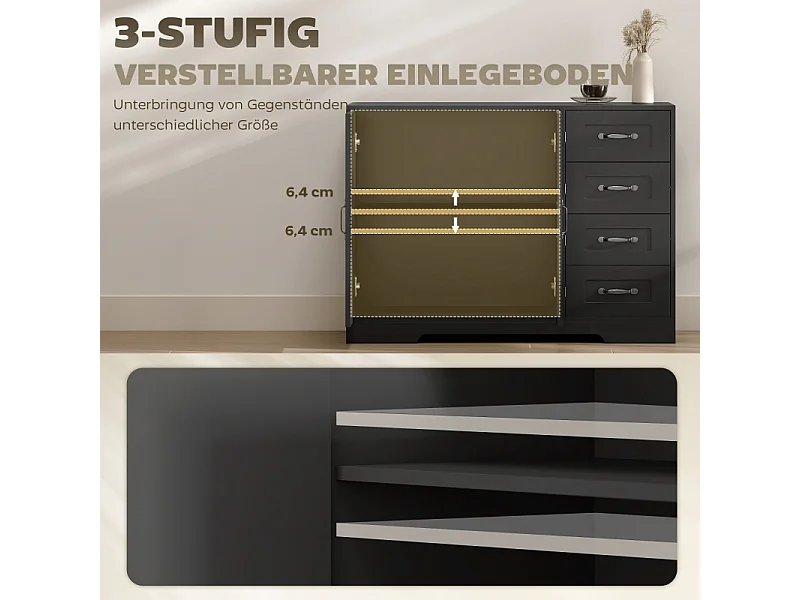 Modern zwart dressoir, 4 lades + 1 deur, 105 x 40 x 76 cm, woonkamer en slaapkamer