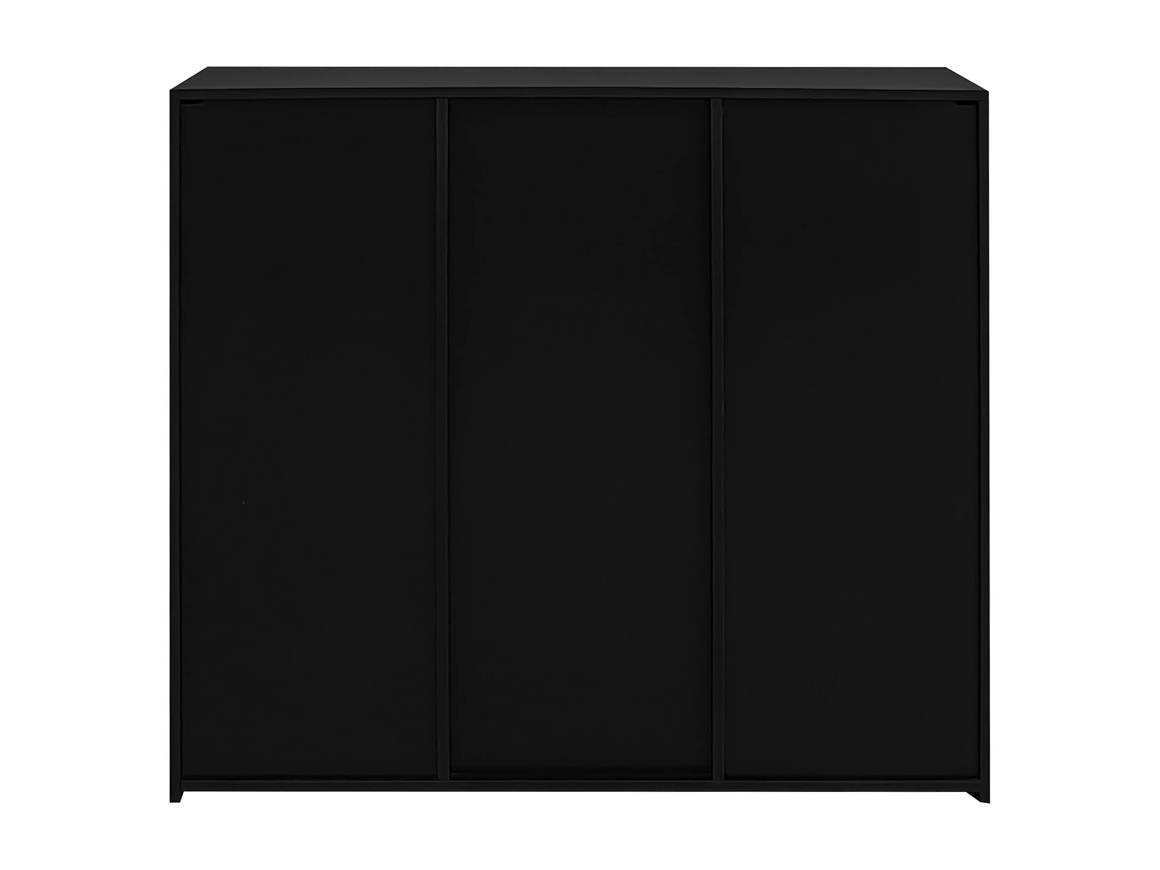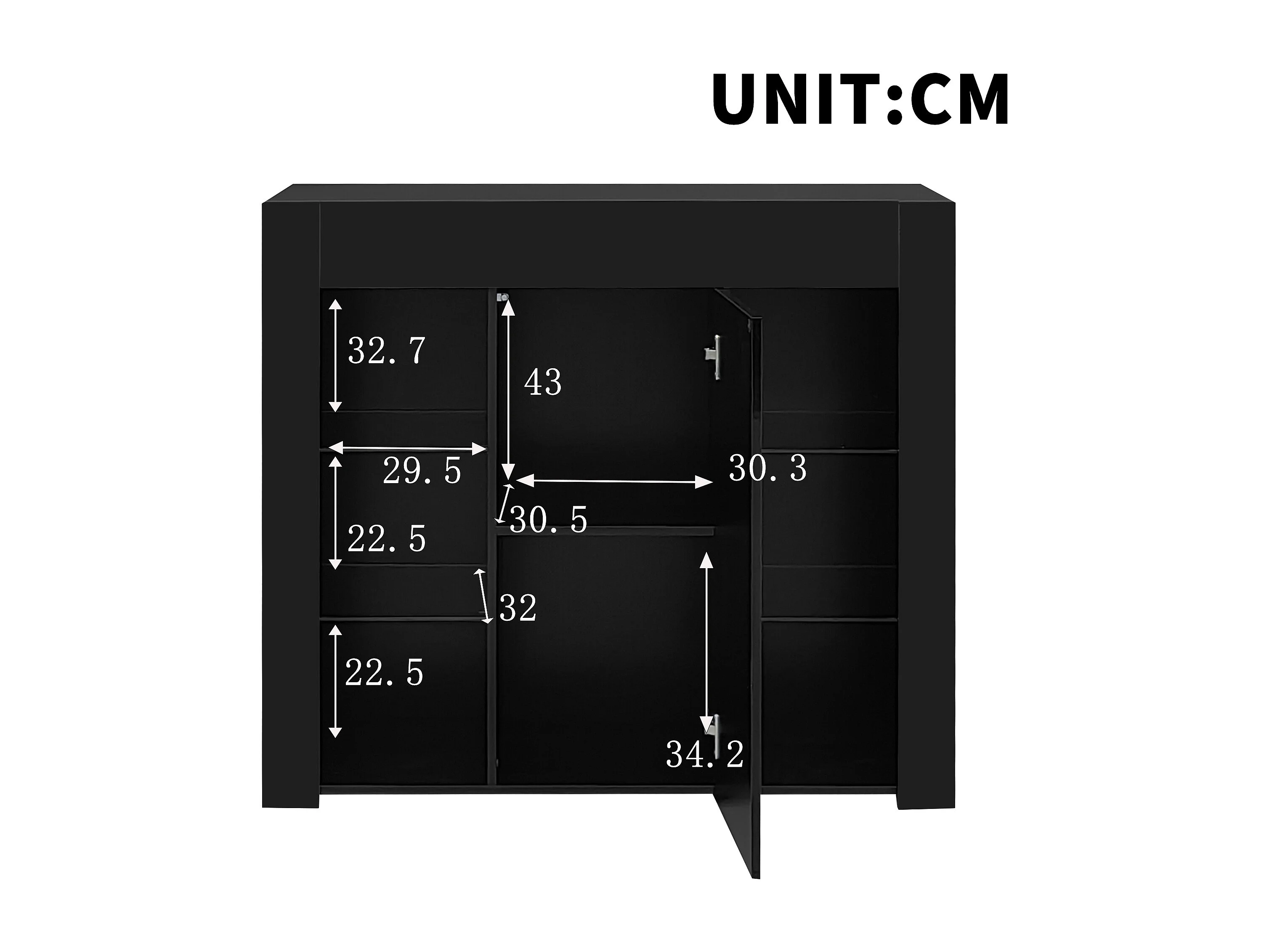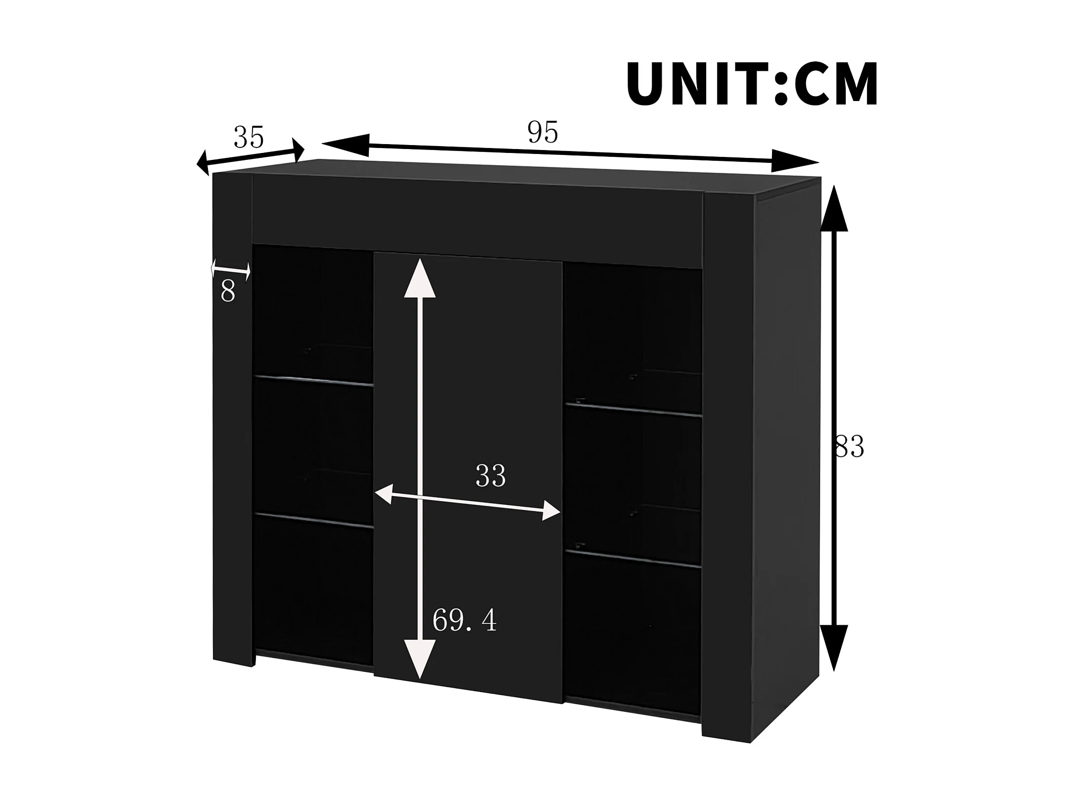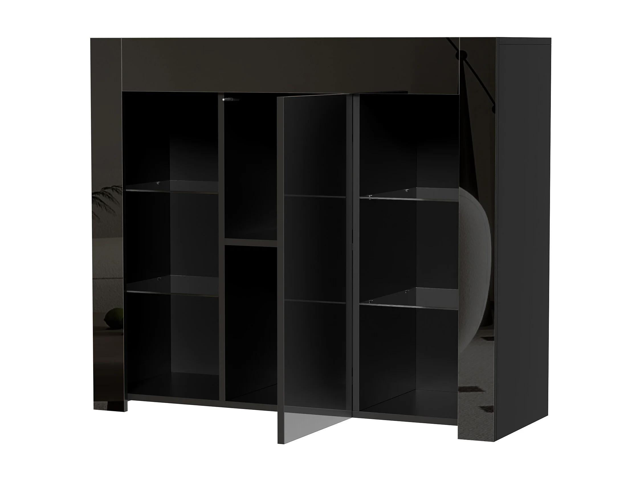 Modern zwart dressoir met glanzend front, glazen planken, compacte opbergruimte 95 x 35 x 83 cm