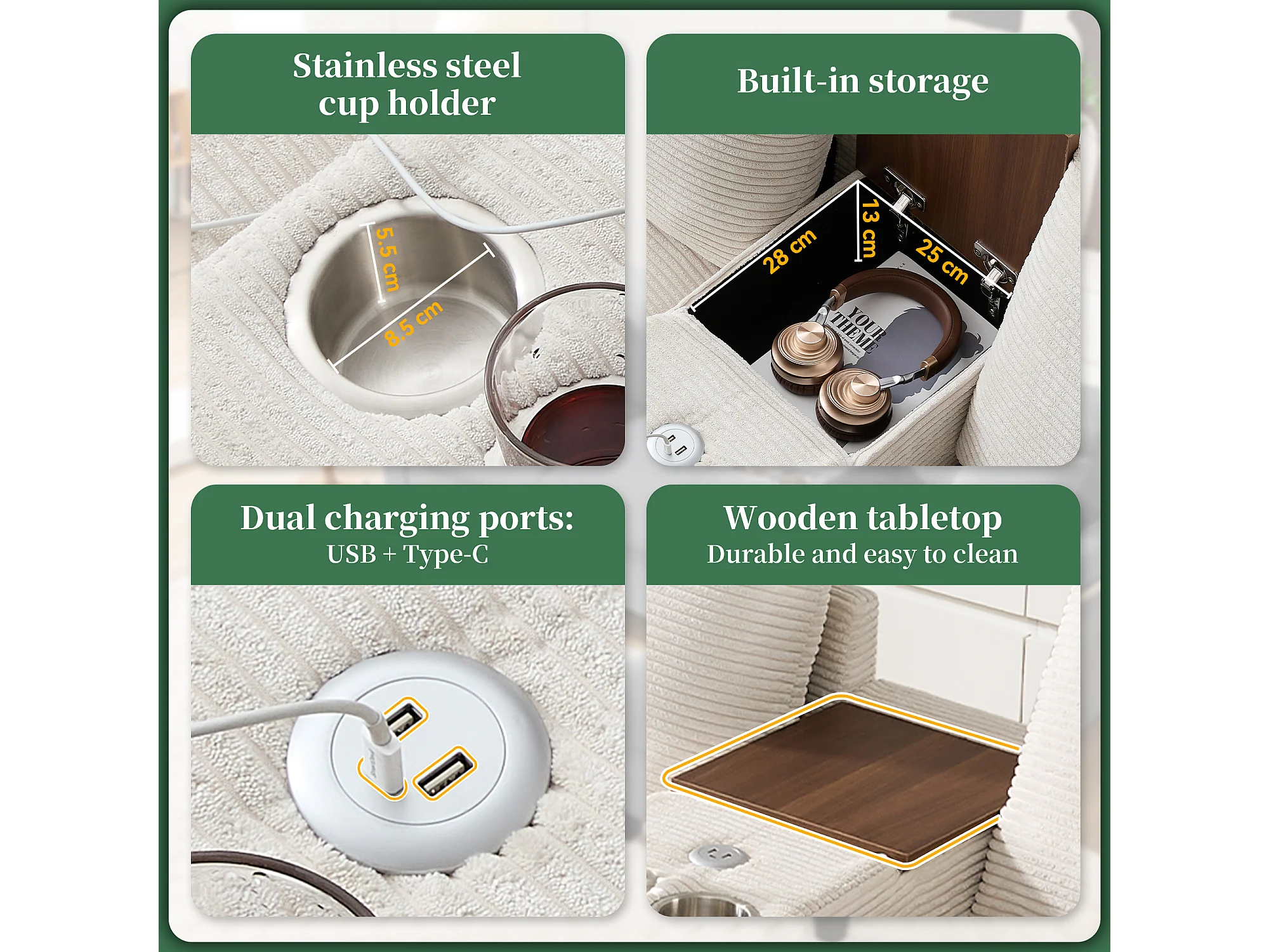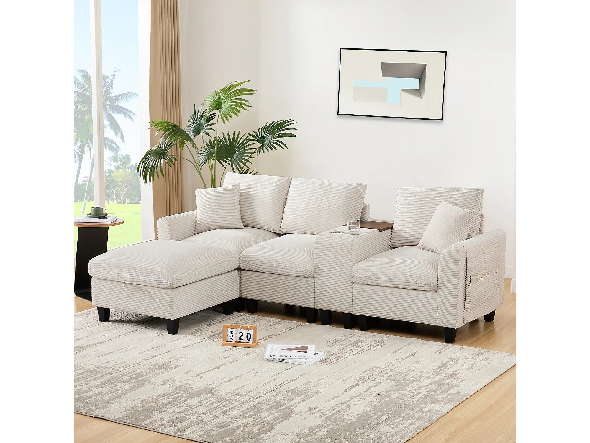 Moderne 4-zitsbank met opbergruimte voetenbank + 2 bekerhouders + USB-aansluiting - 229 x 149,5 x 83 cm - Fluweel - beige