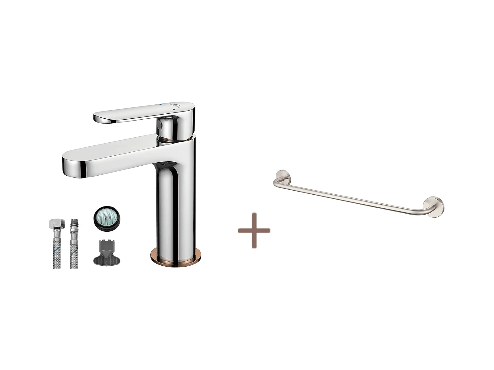 Moderne badkamerkraan, AURALUM MAX wastafelmengkraan, roségouden afsluiting, verchroomd+60cm handdoekhouder badkamer zelfklevend of borend in 304 roestvrij staal