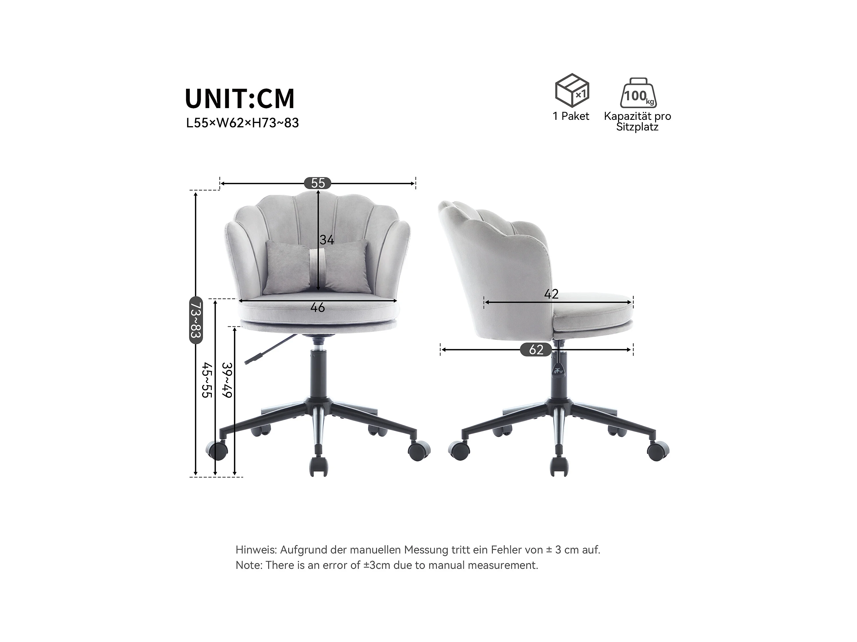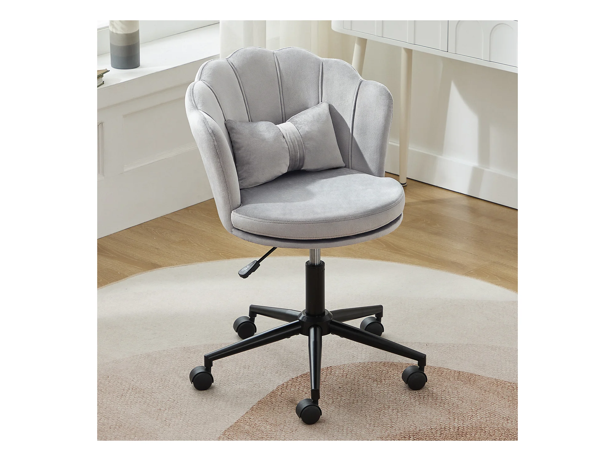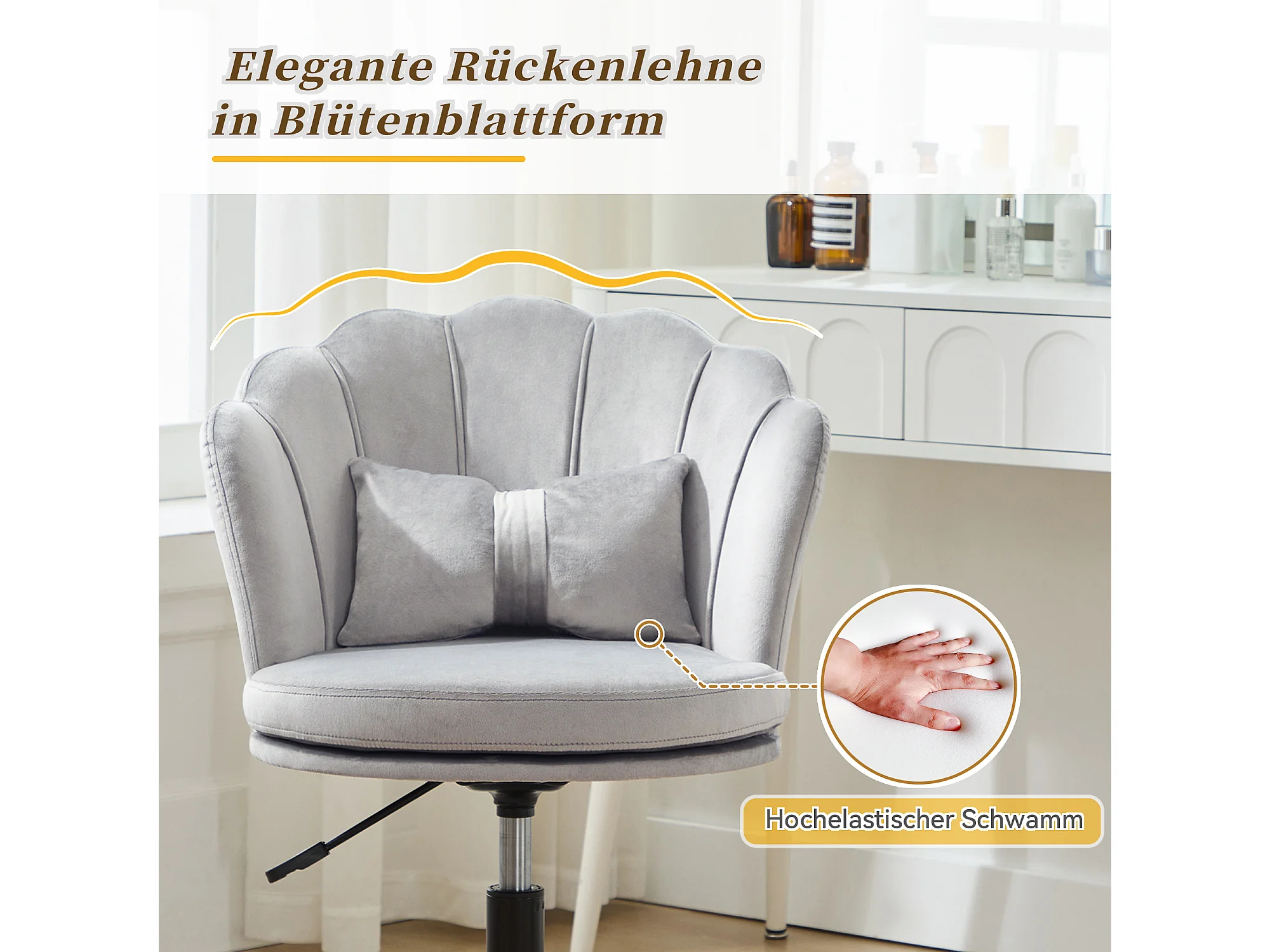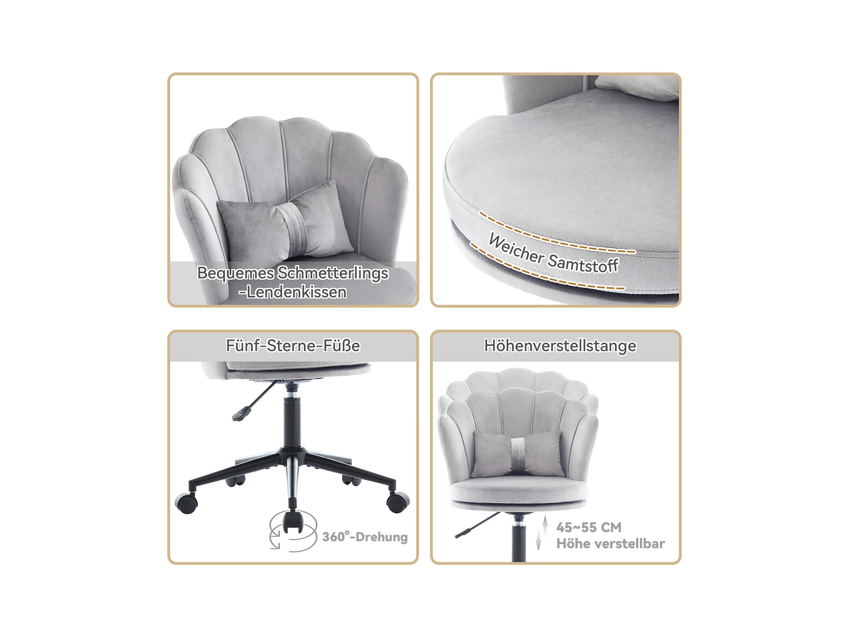 Moderne bureaustoel, elegant design, rugleuning in bloemblaadjesvorm, vlindervormig lendenkussen, in hoogte verstelbaar, grijs (55x62x73-83 cm)